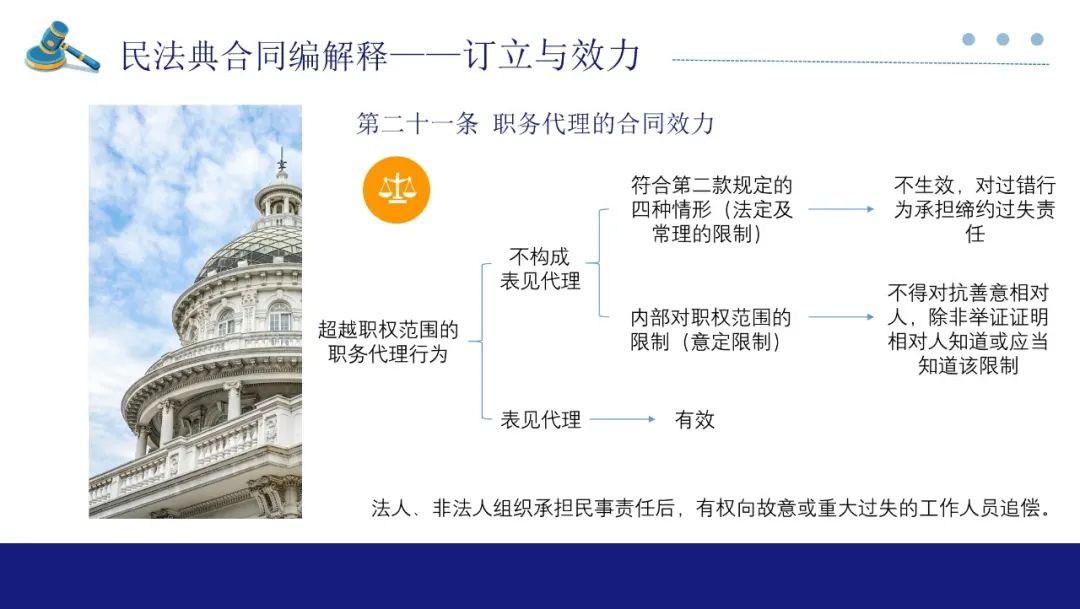 第21条规定的是职务代理的合同效力,其法律理念及整体的审理思路与第20条基本一致,只是当职工越权代理但相对人有合理理由相信行为人有代理权,构成表见代理的,适用表见代理制度,而非适用越权代表制度,此时合同仍对法人生效。