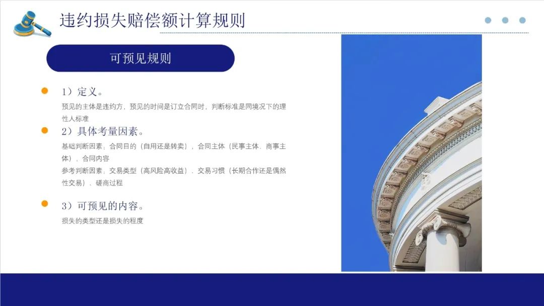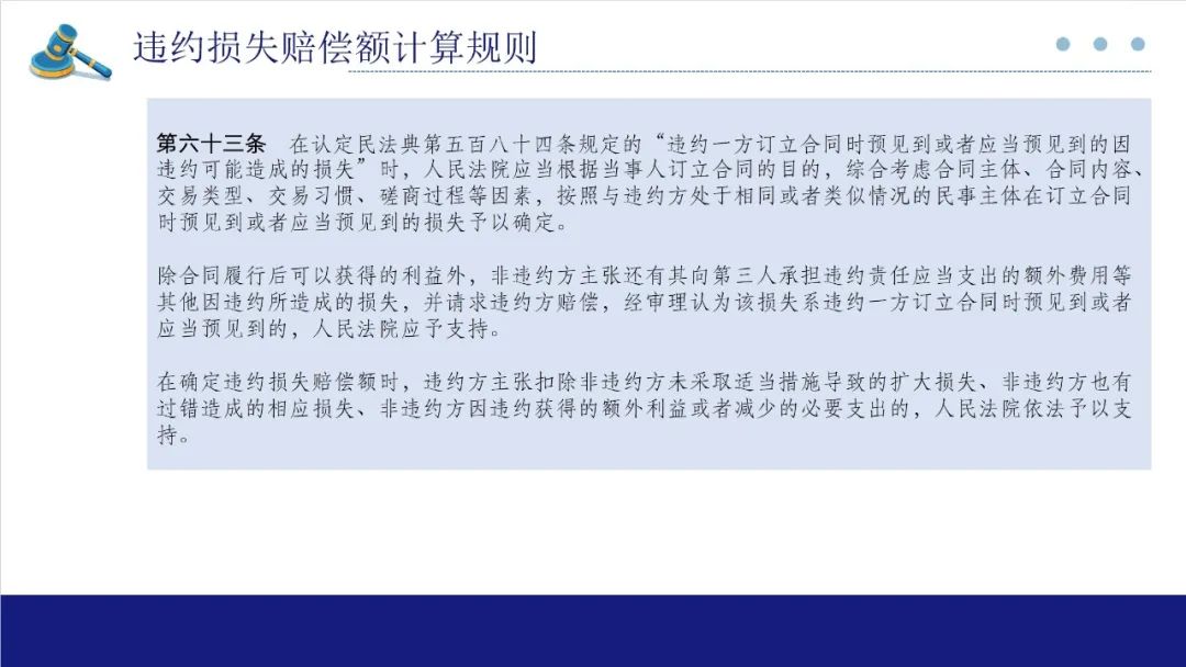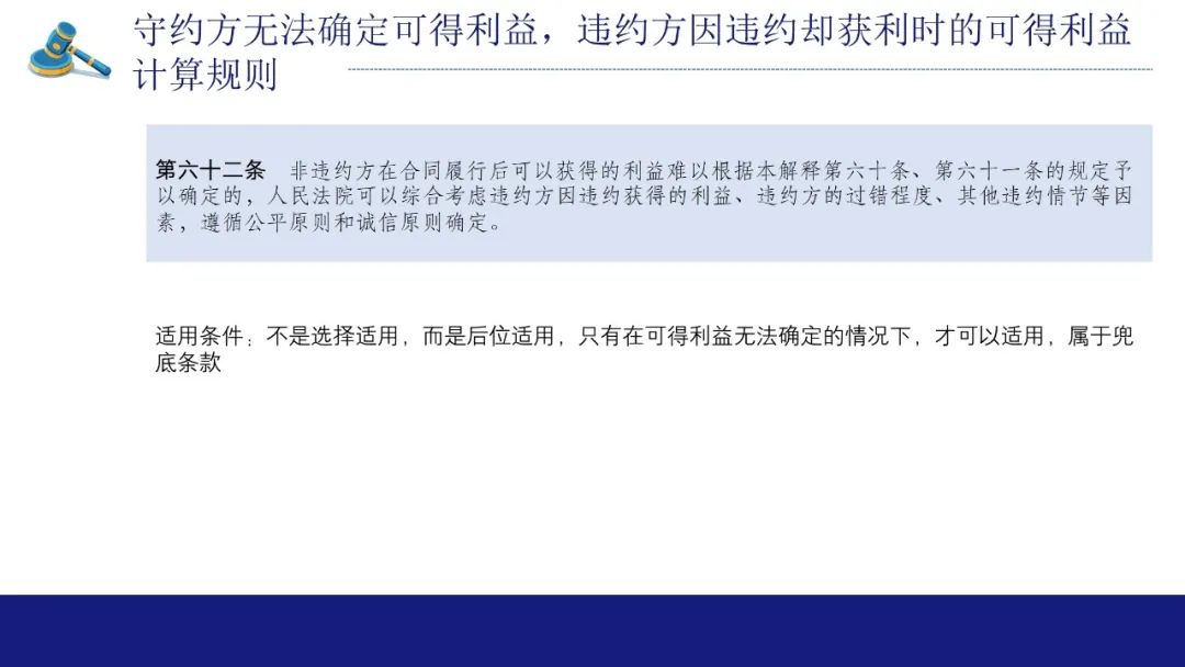 实践中大量存在当事人的可得利益损失难以计算,而违约方可以利用违约行为获益的情形,该条针对这种情况,以违约方的获益为基准,结合过错程度、违约情节确定非违约方的可得利益损失。解释第63条规定法院在确定这一可预见损失范围应当纳入考量的因素,包括合同主体、内容、交易类型、交易习惯、磋商过程等。