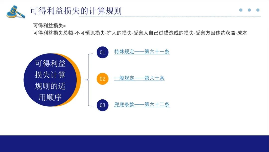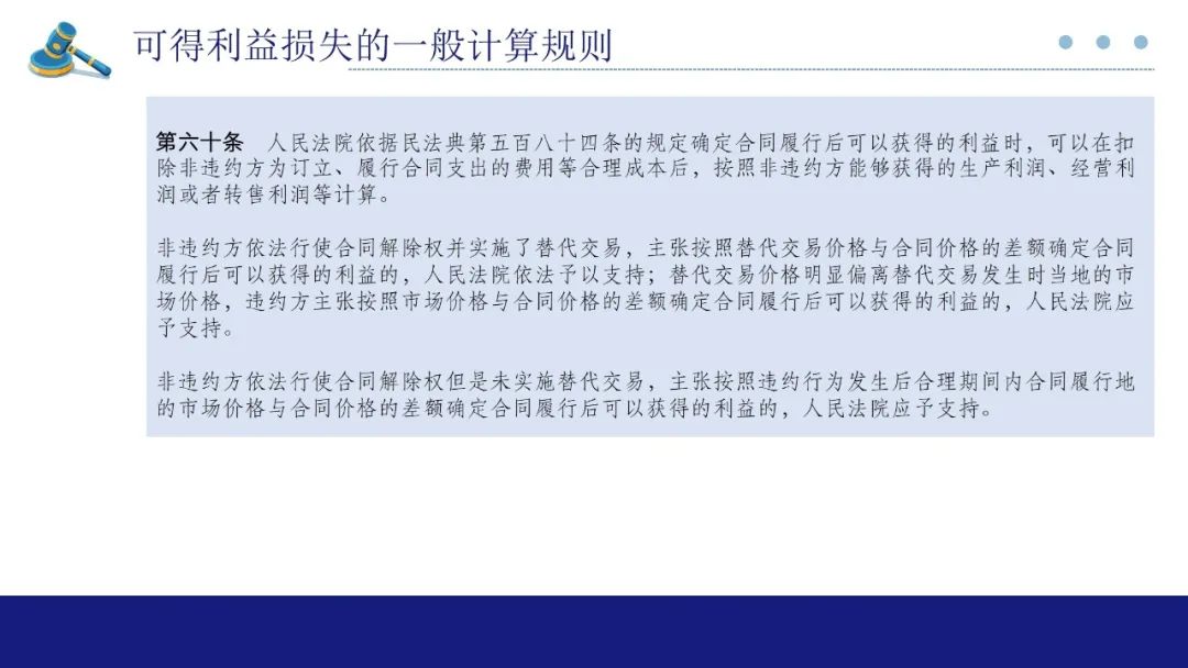 该章第60条、61条、62条共同组成了可得利益的计算方法体系。第60条是可得利益损失计算的一般规则,第61条是针对持续性定期合同的可得利益损失计算特殊规定,第62条为前两条均难以确定可得利益的兜底规定。