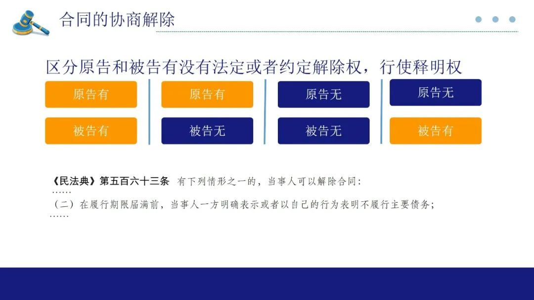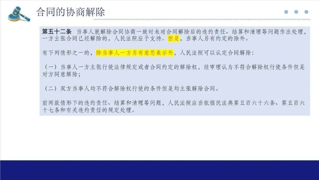 第52条涉及合同的协商解除。若双方对于解除合同已经达成一致意见,但对于违约责任是否承担未能达成一致,根据该司法解释,法院仍然可以解除合同,除非双方有清理、结算事项也要达成一致才可以解除合同的约定。第二款在适用时主要涉及到法院释明权的问题。如果双方都没有解除权又都同意解除合同,法院要探究双方同意解除合同的真意,通过释明告知双方若不存在解除权的情况下,原告是否还要解除合同,被告是否还同意解除合同。