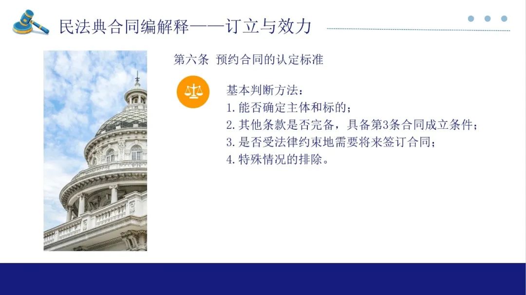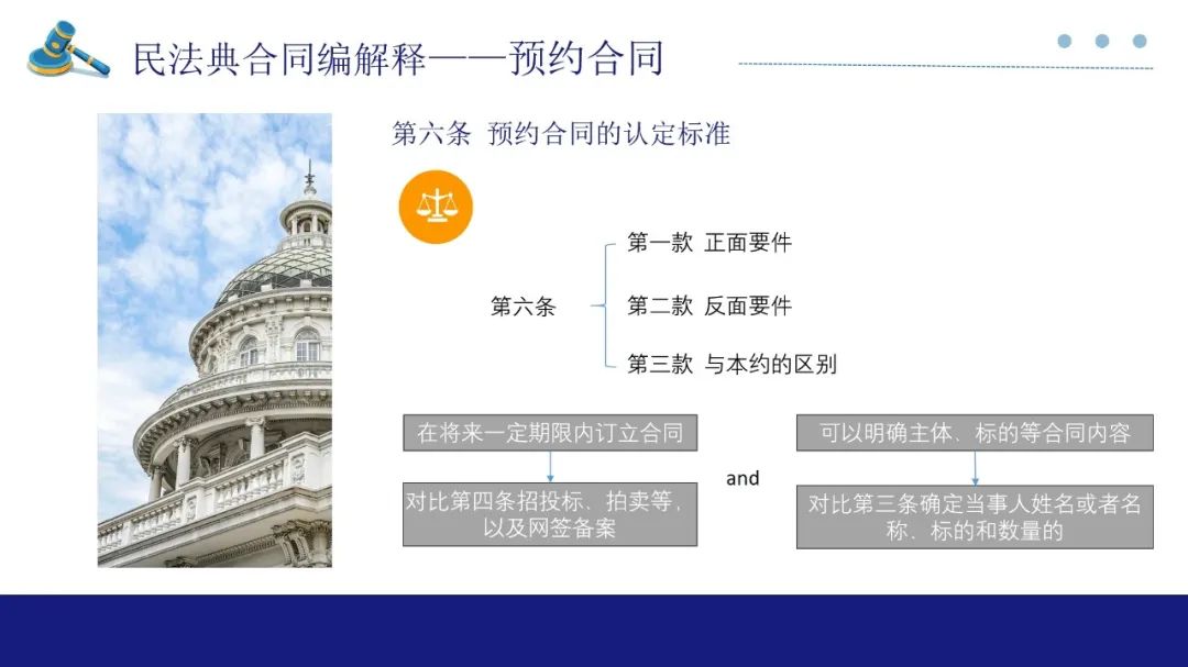 第6条是预约合同的成立,主要是对比本约合同的成立。对第6条的要件提取公因式:在将来一定期限内订立合同并且可以明确主体、标的。这里就涉及与本司法解释第3条、第4条的衔接。符合第3条本约成立的,不再认定为预约。虽然有些招投标、拍卖中明确需要另行签订合同,但并不构成预约,本约的成立以该条确认的时间、内容为准(第4条)。