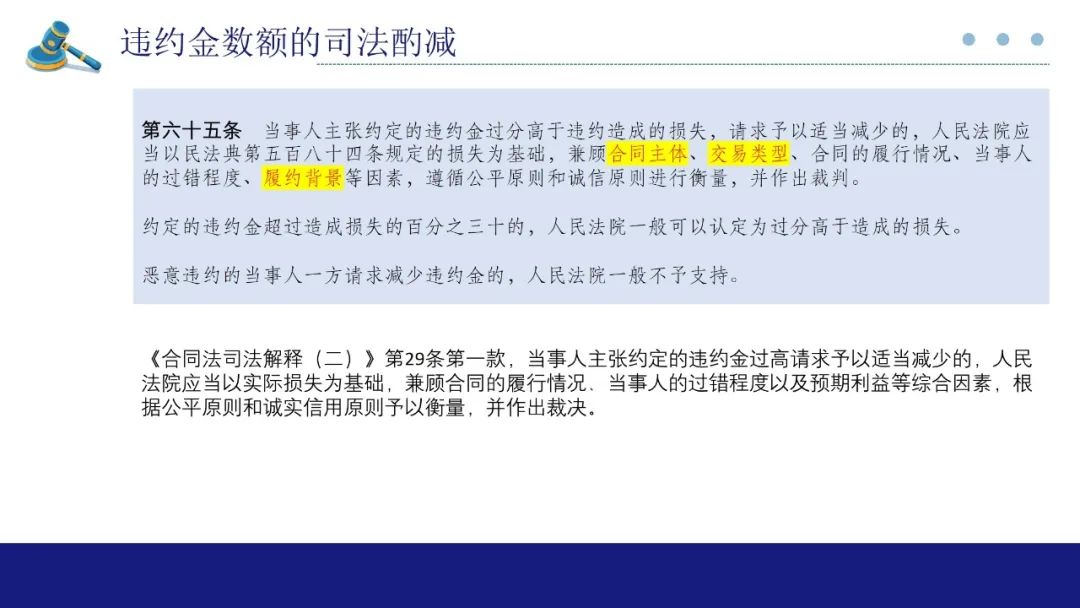 第65条是违约金数额的司法酌减。本条第一款我们可以对照合同法解释二第29条的规定来看,相对于合同法解释,本条解释对于调整时需要考量的因素增加了合同主体、交易类型以及履约背景等。关于合同主体,可分为民事主体和商事主体,有观点认为,商事主体相对于民事主体,在缔约能力,预见能力,违约金约定等方面明显较强,司法解释新增了合同主体这个考量因素,即意味着对于商事主体的违约金调整要从严,甚至可以不予调整;这个还是要通过个案进行把握。