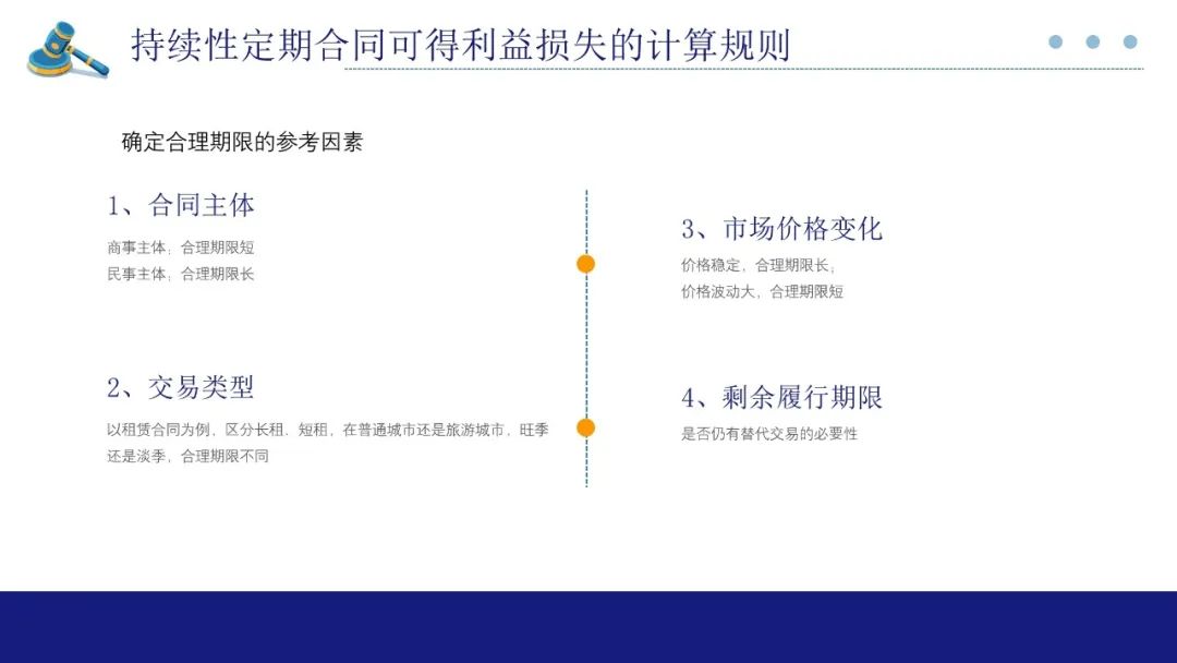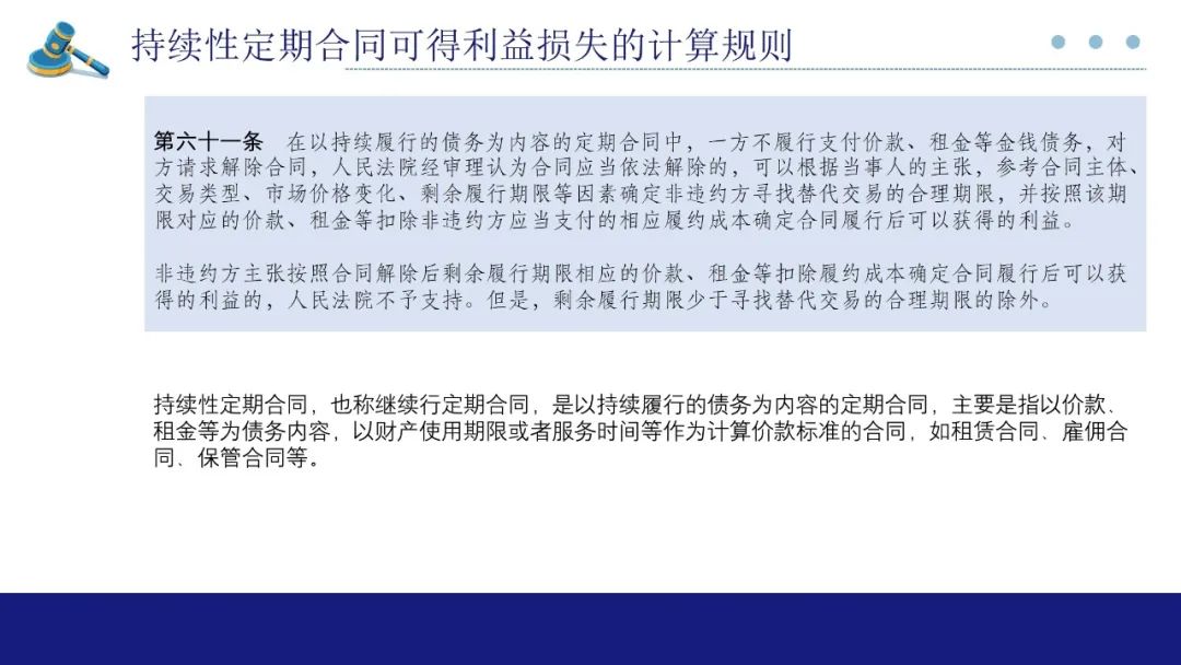 解释第61条规定,持续性定期合同一方不履行金钱债务,对方主张解除合同,参照合同主体、交易类型、市场价格变化、剩余履行期限等因素确定替代交易的合理期限,根据该期限对应的价款扣除履约成本后确定可得利益。该规则遵循的也是减损规则,通过限制非违约方主张持续性合同的可得利益损失金额,督促非违约方积极寻找替代交易,减少违约损失的扩大。