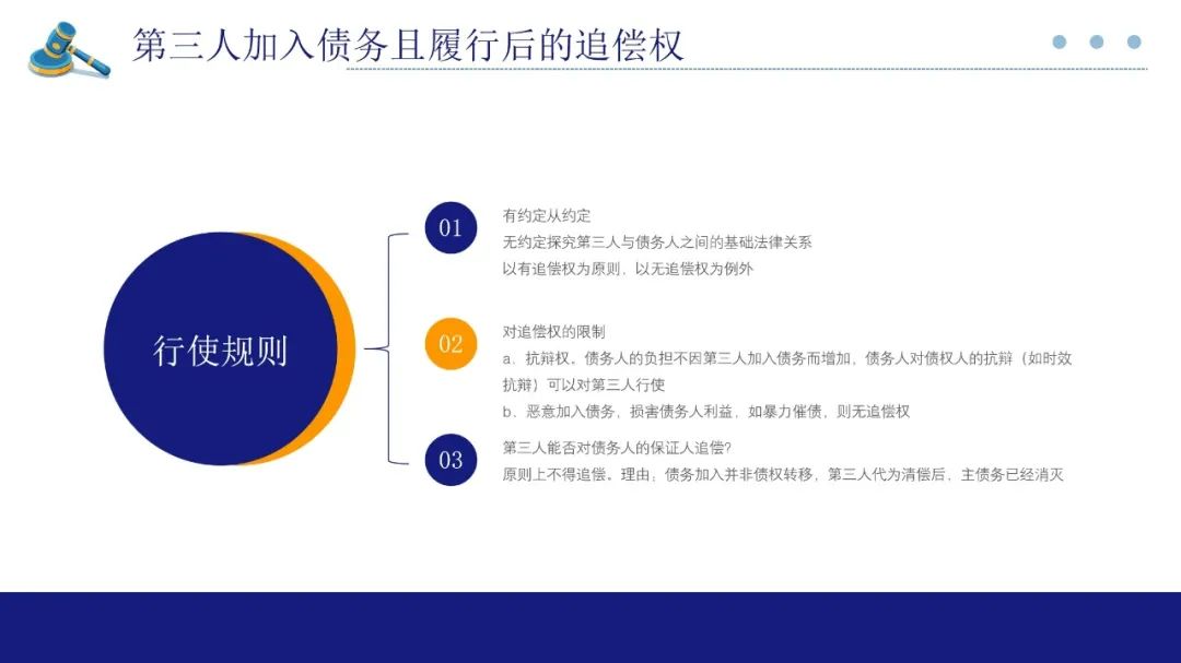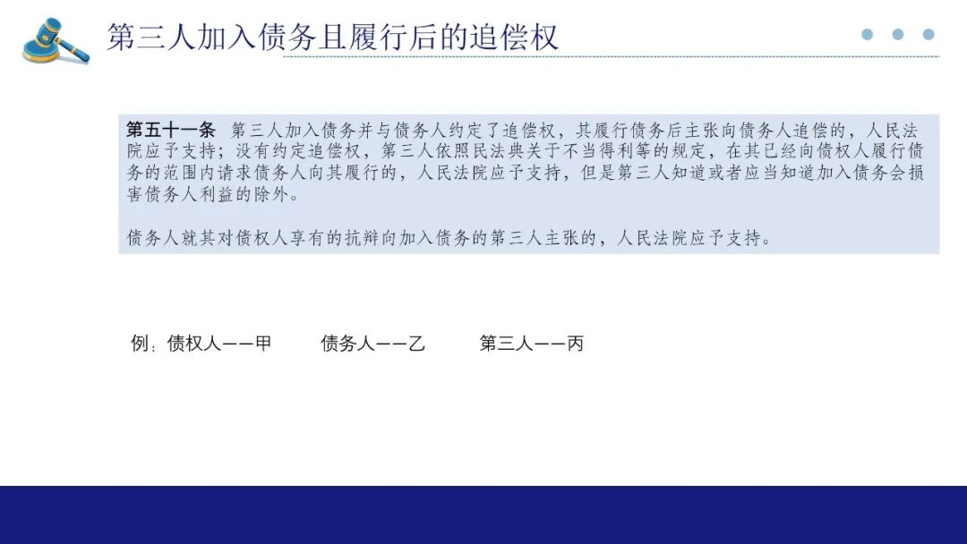 第51条规定的是第三人加入债务的追偿权,该条所规定的的第三人区别于民法典第524条所规定的代为履行的第三人,该条规定第三人以履行该债务具有合法利益为前提,代为履行后,第三人取得债权人地位。