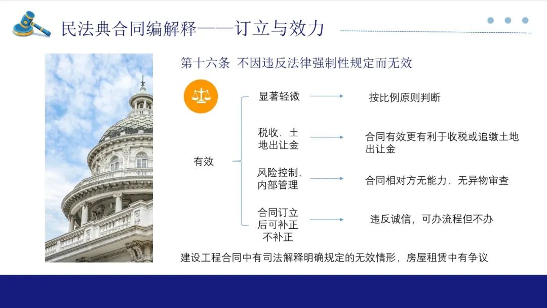 关于第16条,由于《民法典》生效后已取消效力性强制性规定和管理性强制性规定的区分,本条明确了合同不因违反强制性规定无效的情形。