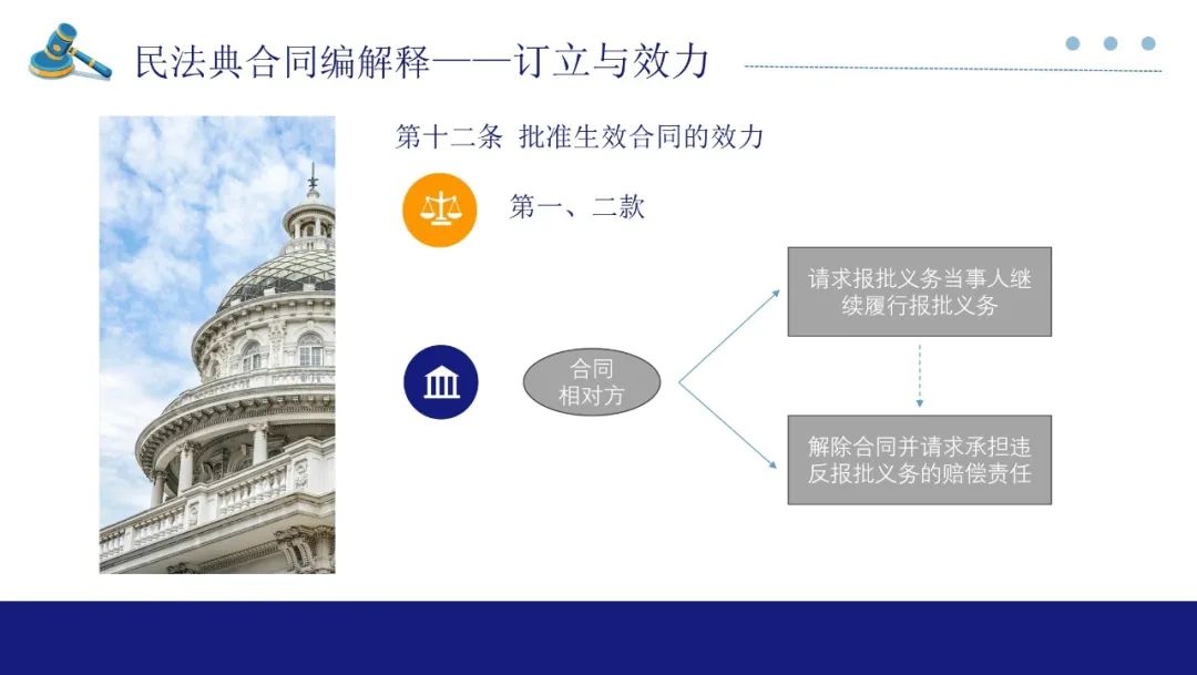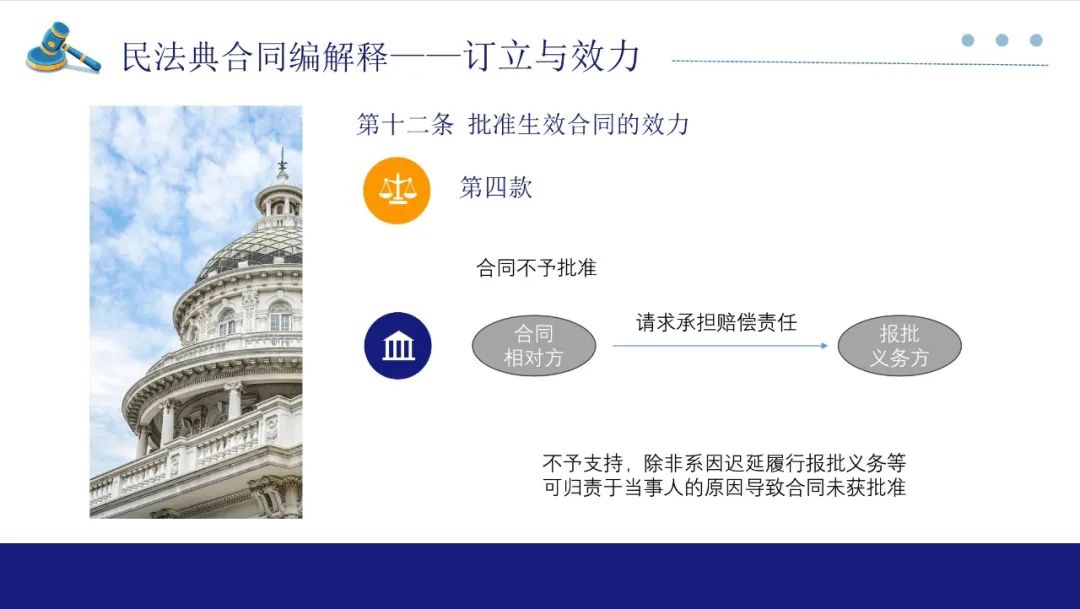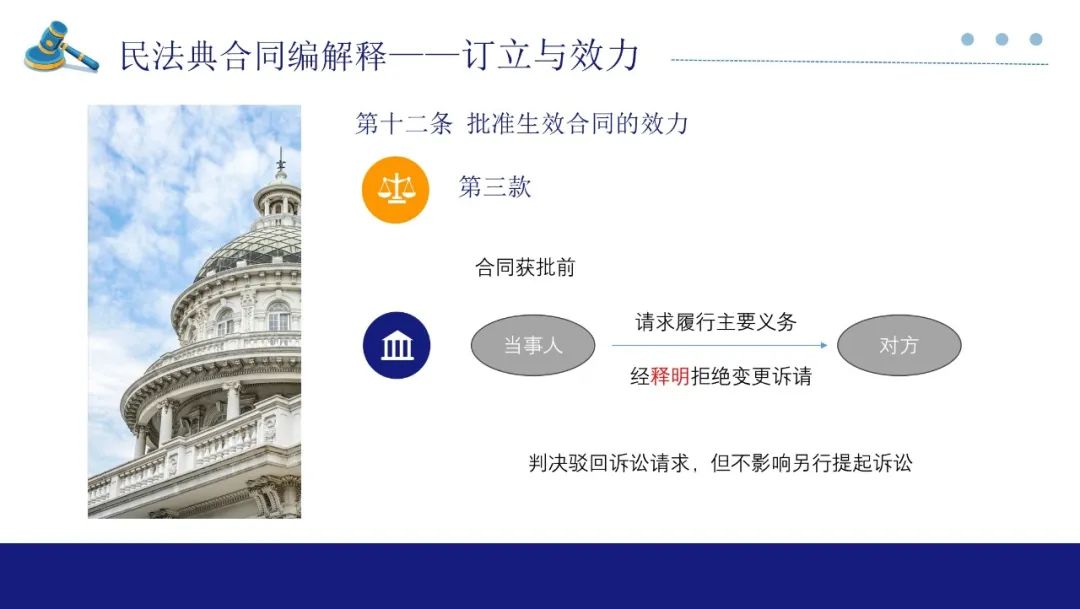 如果法院判决履行报批义务后当事人仍不履行,对方可以要求解除合同并参照违约责任请求承担赔偿责任来维护自身权利。此处也是缔约过失责任,但此时的报批义务人过错更大,故规定参照违约责任处理。如果获批前,当事人一方起诉请求对方履行合同约定的主要义务,经释明后拒绝变更诉请,法院应判决驳回诉讼请求,但不影响其另行起诉。
