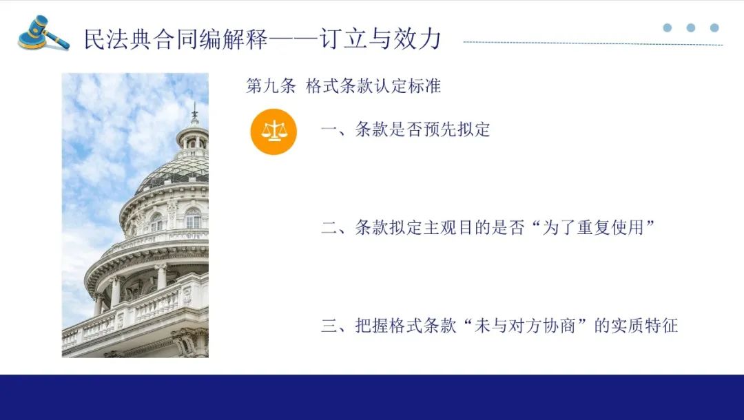 第9条格式条款,这是我们在审理合同类案件中经常碰到的,尤其是保险合同案件。格式条款的审理难点主要在两个方面,一是格式条款的认定标准,二是提供格式条款一方是否尽到提示、说明义务。