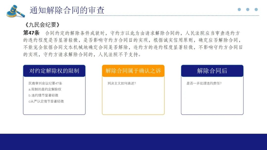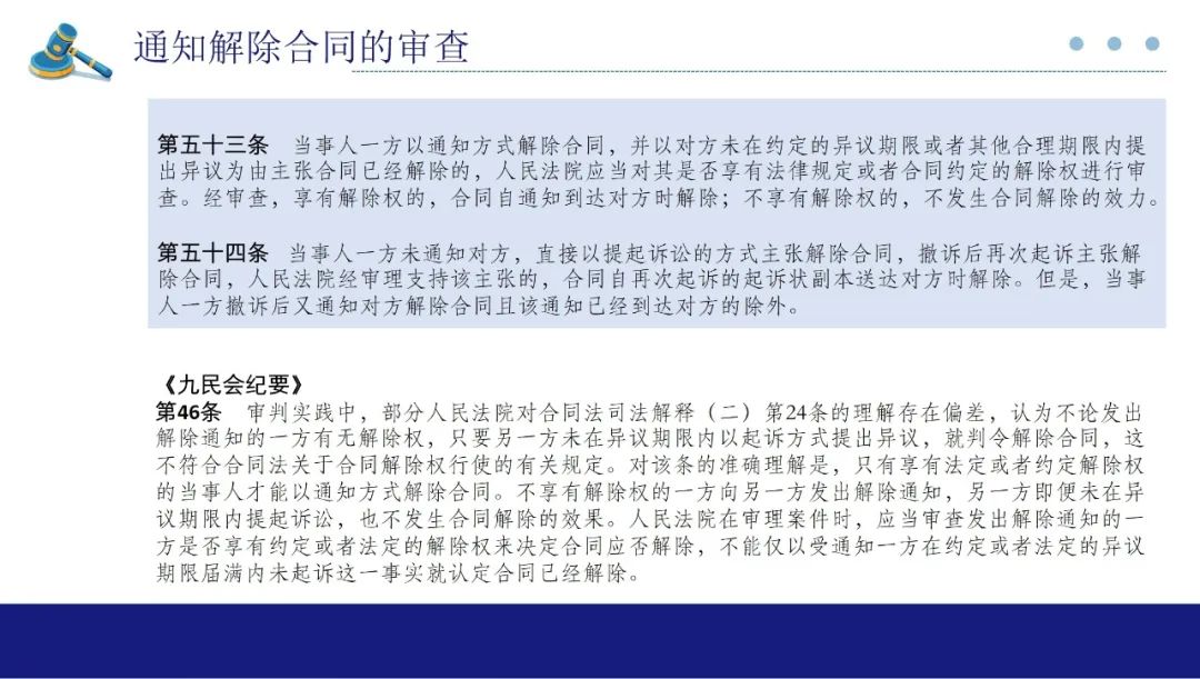 第53条涉及通知解除合同的审查,延续了九民会议要第46条的规定。即法院不再审查有无异议期内起诉,而是重点审查通知方有无解除权,有解除权,解除通知发生效力,无解除权,解除通知不发生效力。在适用该条司法解释时,我们要还要注意与九民会纪要第47条的衔接,第47条实际上是对约定解除权进行了限制,即违约方违约情节显著轻微的情况下,即使守约方根据约定发出了解除通知,法院也不能机械的解除合同,而是让违约方承担其他的违约责任。但如何认定违约情节显著轻微,还是要根据合同主体、交易类型、磋商过程等因素从严把握。