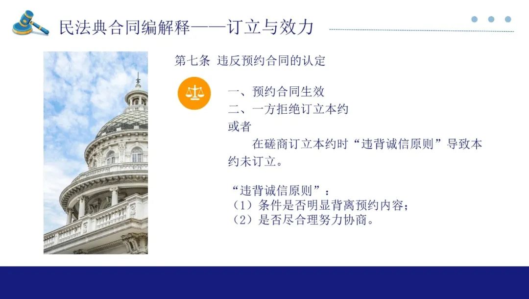 第7条是预约的违约认定,该条相对比较明确。要件为(1)预约合同生效;(2)一方拒绝订立本约或者在磋商订立本约合同时违背诚信原则导致未能订立本约。第二款是对第一款要件中违背诚信原则的细化:条件是否明显背离预约内容,是否尽合理努力协商。
