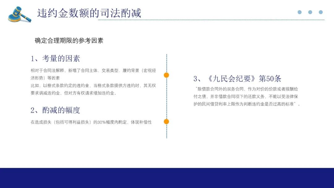关于履约背景,即要考虑宏观经济形势,比如在经济形势严峻时期,违约金过高会增加当事人的交易成本,偏离违约金的补偿性为主的基本属性。本条第二款确定的是违约金调整的幅度。有观点认为,约定的违约金超过造成损失的百分之三十是调整的原因,并非调整的结果,也就是说法院调整后,可以超过造成损失的30%。我们同时也要克服另外一种倾向,违约金习惯性按照民间借贷的利率保护上限来进行调整,所以九民会纪要第50条进行了纠正。