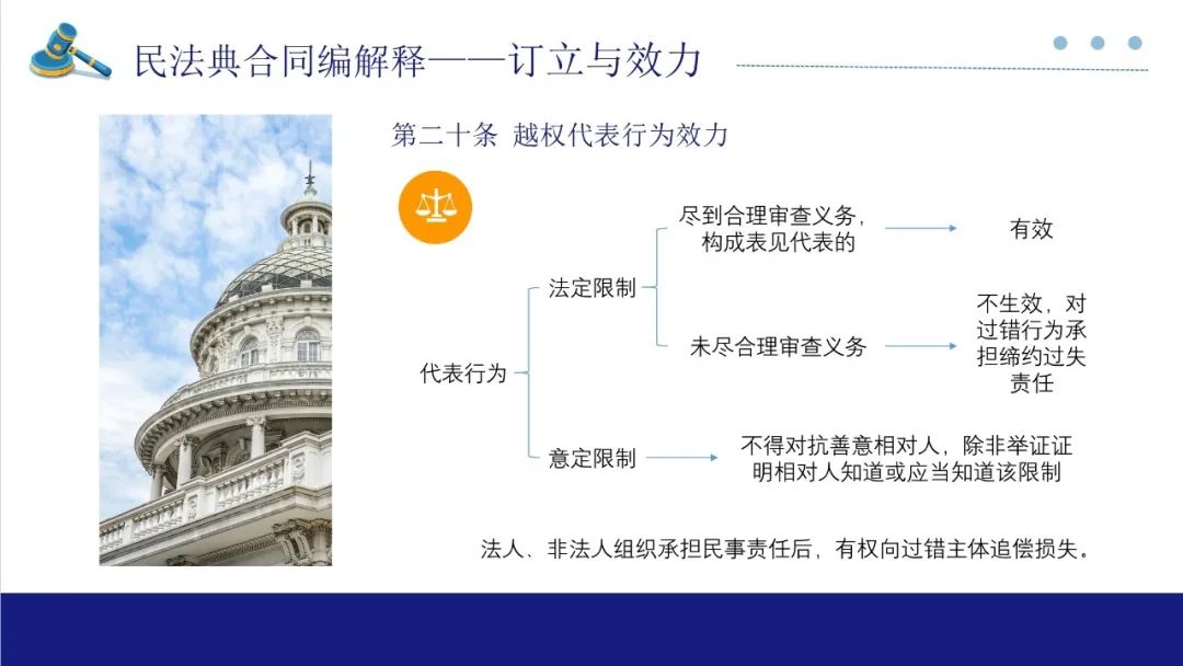 对于法人行为效力的规定。第20条规定的是越权代表行为的效力。司法实务中,主要把握以下两点:一是对代表权限制的情形,主要分为法定限制和意定限制。法定限制即法律规定所作出的限制,最典型的就是公司对外担保,一定需要审查股东会决议或董事会决议,这是法律对担保权作出的限制。二是意定限制,主要以法人章程或权力机构对于法定代表人所作出的除法律规定外的特别限制。