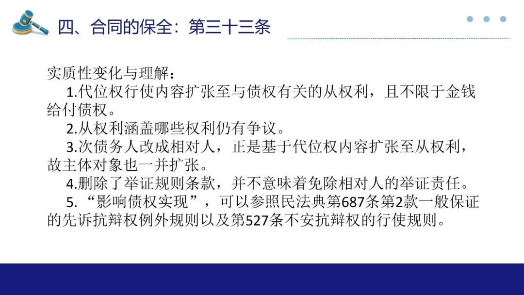 第33条确认了代位权行使内容扩张至与债权有关的从权利,且不限于金钱给付债权,意味着包括财产给付内容的债权也可代位行使,与民法典535条保持一致;从权利涵盖哪些权利仍有争议,无争议的是担保性权利;有争议的是形成权诸如合同解除权及撤销权、债务抵销权等,肯定论认为允许债权人代位行使有利于充分发挥保全债务人责任财产的职能,否定论认为形成权明显超出了债权人代位权立法文义范围,也过度干涉了他人的意思自治。最高院初步意见是如果不允许代位行使合同解除权或撤销权等形成权,就无法产生相应财产返还或损害赔偿之债的,仍有必要赋予债权人代位行使的权利,可在实践中作必要探索。