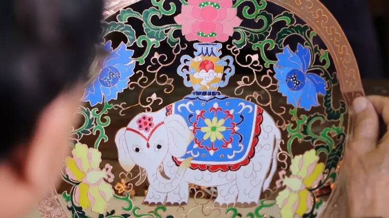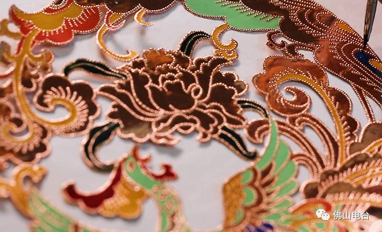 铜凿剪纸就将薄似纸的铜箔一叠叠起来,再用凿的珠刀,一点一点地将剪纸的图案凿出来,凿完珠点以后,再根据图案不同的形象填上不同的色彩。