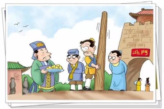春秋战国时,秦国的商鞅在秦孝公的支持下主持变法。当时处于战争频繁、人心惶惶之际,为了树立威信,推进改革,商鞅下令在都城南门外立一根三丈长的木头,并当众许下诺言:谁能把这根木头搬到北门,赏金十两。