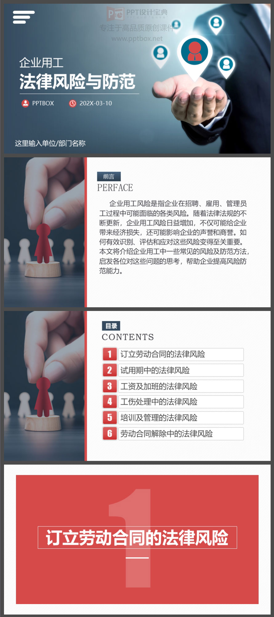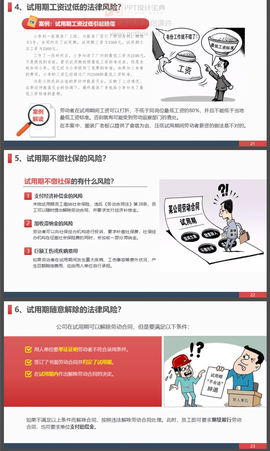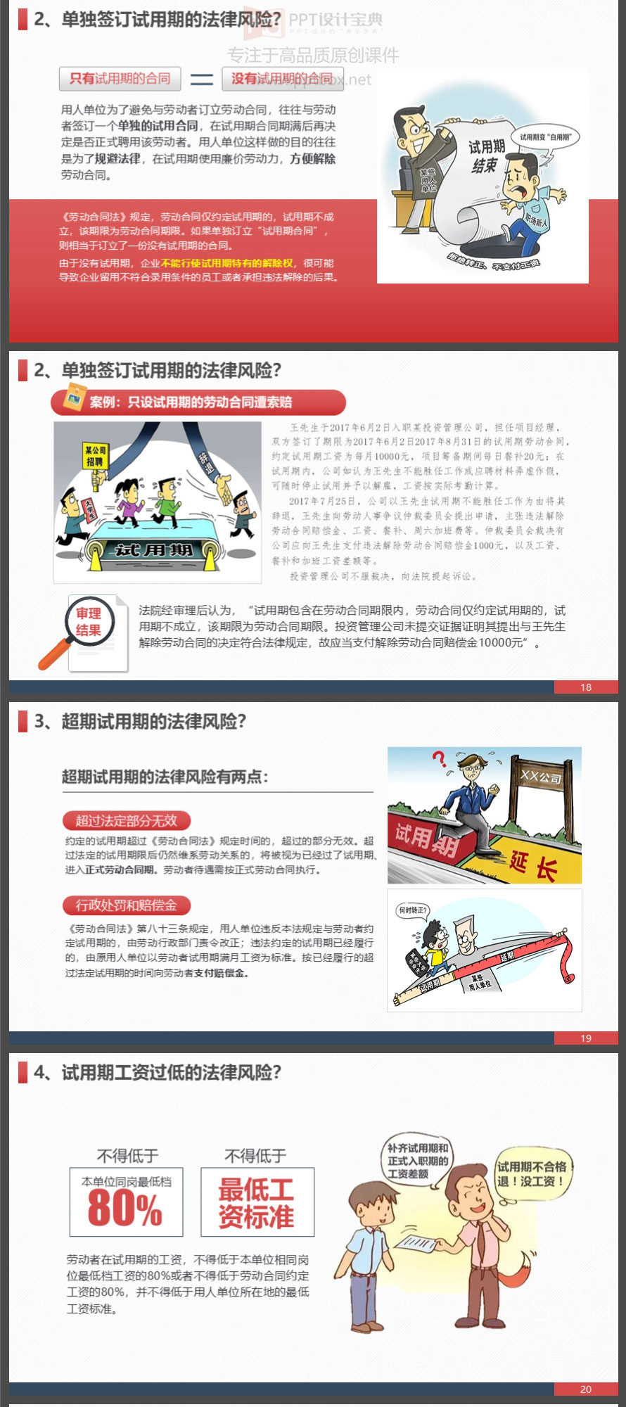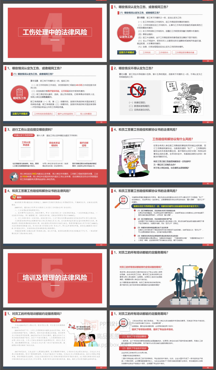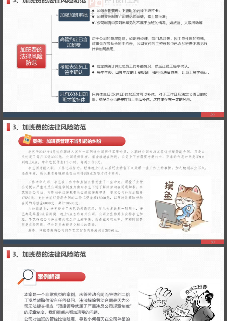 企业用工风险是指企业在招聘、雇用、管理员工过程中可能面临的各类风险。该PPT是一个关于企业如何有效识别、评估和应对用工风险的课件。通过罗列劳动合同法中的常见风险点,用分析真实案例的形式,来引出常见用工风险点及防范方法,使听众可以举一反三,自觉的关注用工各环节中可能出现的法律风险。​可用于企业人事部门用于普法培训学习,或者用来作为素材和模板参考。