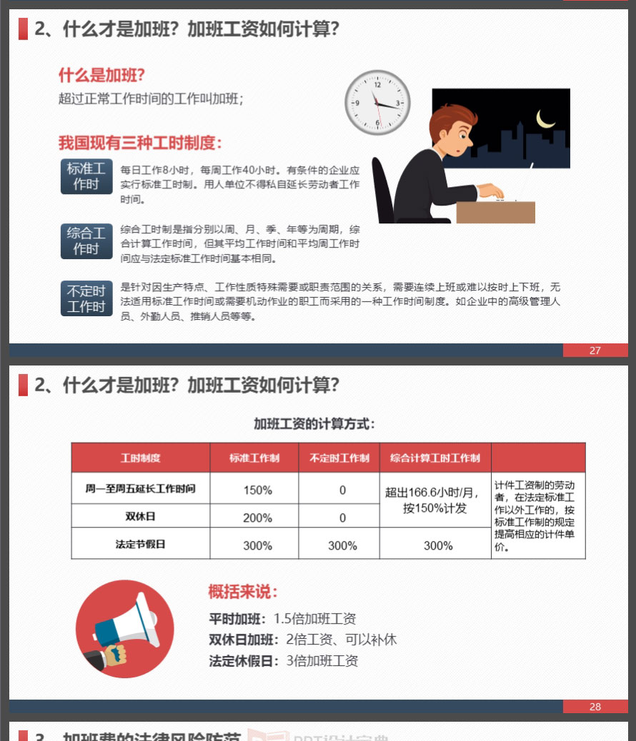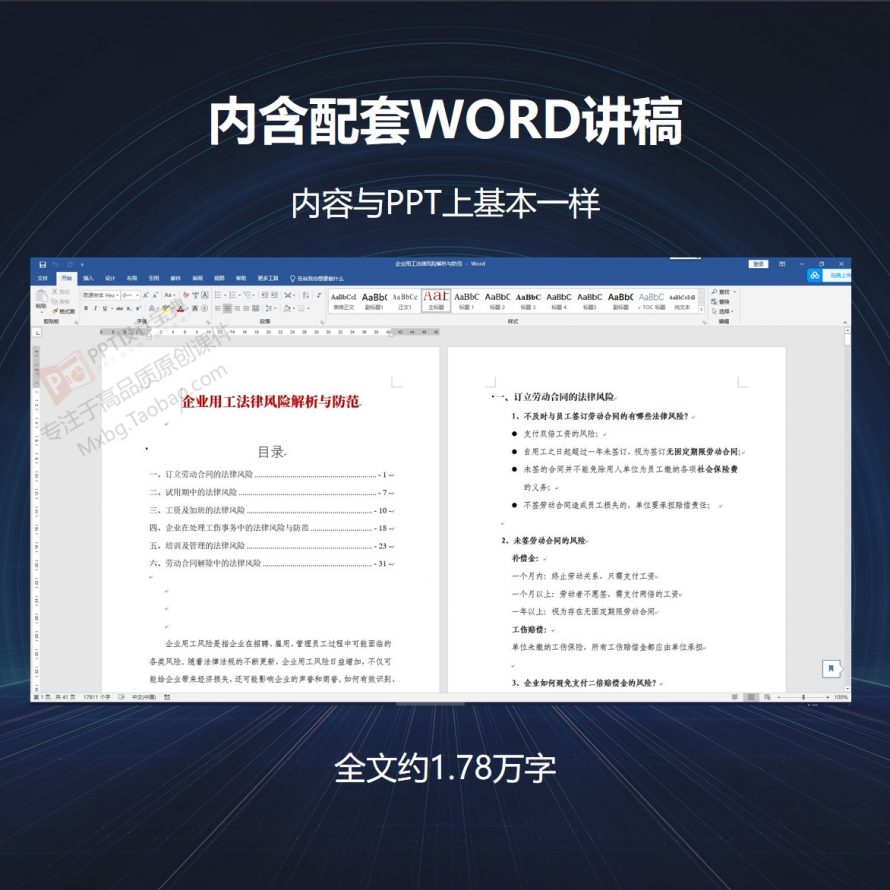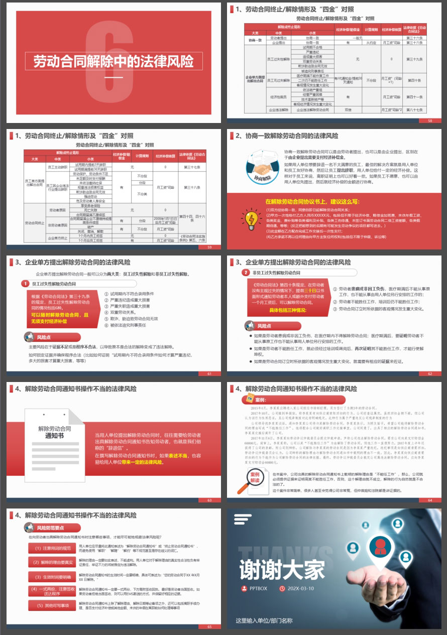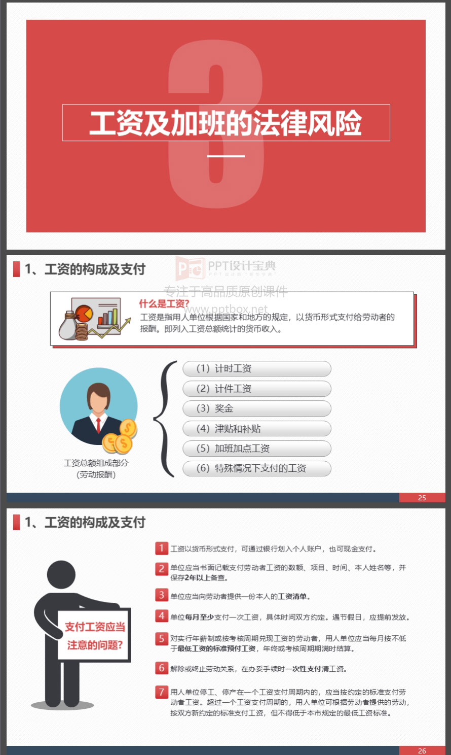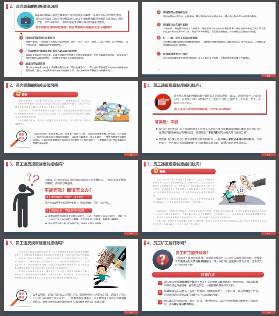 企业用工风险是指企业在招聘、雇用、管理员工过程中可能面临的各类风险。该PPT是一个关于企业如何有效识别、评估和应对用工风险的课件。通过罗列劳动合同法中的常见风险点,用分析真实案例的形式,来引出常见用工风险点及防范方法,使听众可以举一反三,自觉的关注用工各环节中可能出现的法律风险。​可用于企业人事部门用于普法培训学习,或者用来作为素材和模板参考。