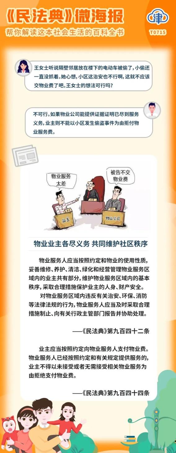 王女士听说隔壁邻居放在楼下的电动车被偷了,小偷还一直没抓着。她心想,小区这治安也不行啊,这就不应该交物业费了吧。王女士的想法可行吗?《民法典》做出解答。