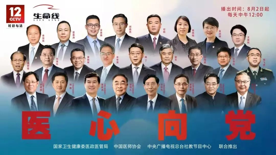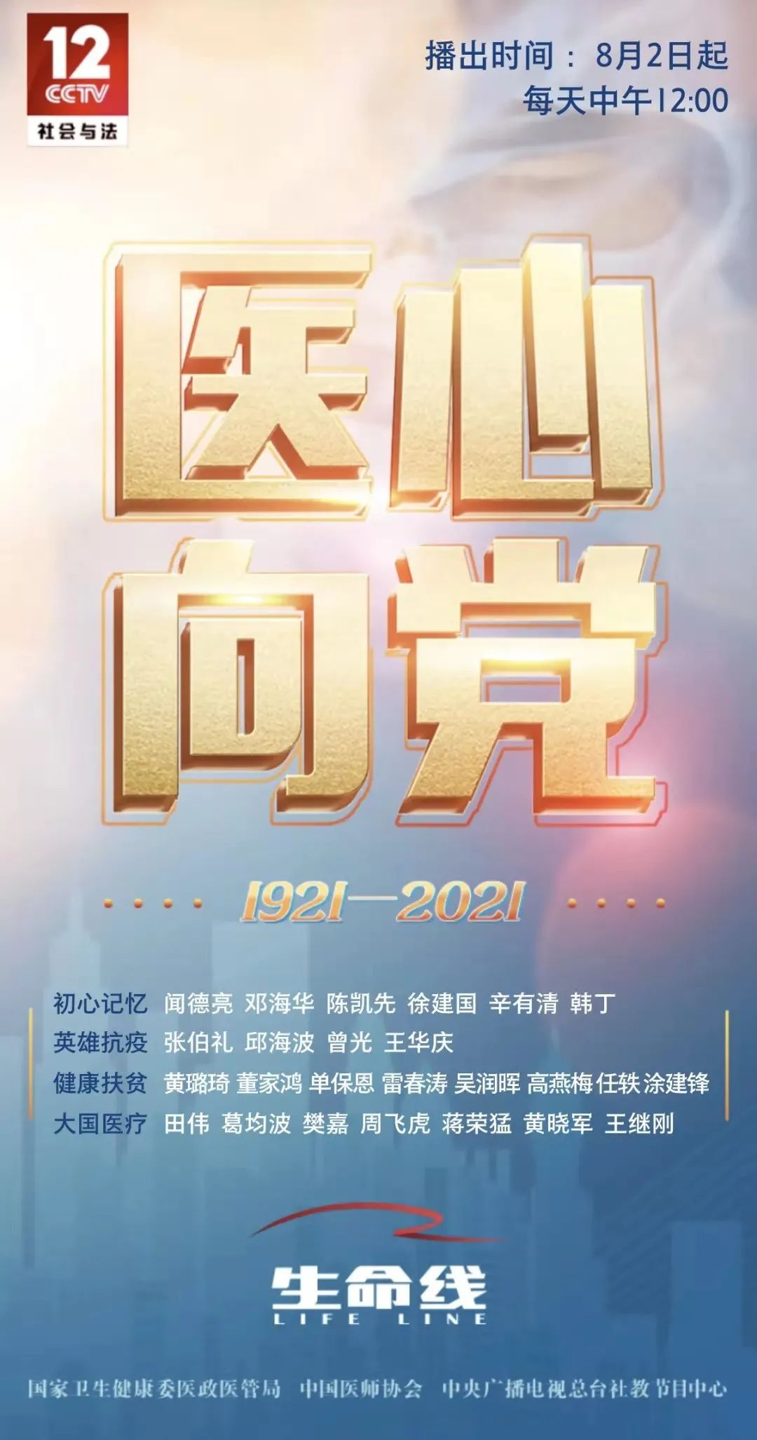为庆祝中国共产党百年华诞,记录中国医疗卫生发展事业,展现中国卫生界与党同频共振的伟大征程,8月2日起,由国家卫生健康委医政医管局、中国医师协会、中央广播电视总台社教节目中心联合推出的大型医疗人文节目《医心向党》,将在中央广播电视总台社会与法频道(CCTV-12)《生命线》栏目播出,一共21集,每集20分钟,每天中午12:00重磅推出。央视频、央视网、健康中国等平台同步播出。