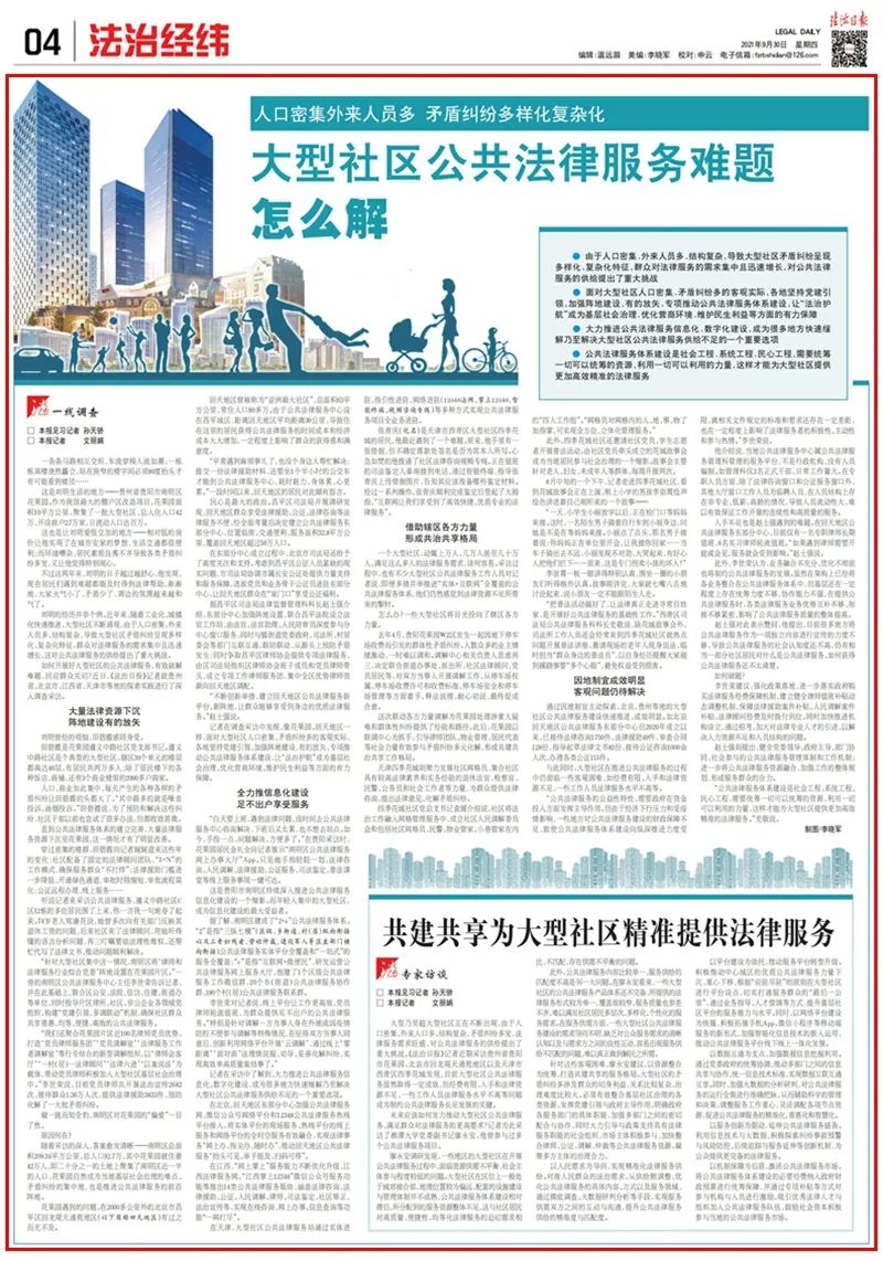 9月30日,《法治日报》法治经纬整版刊发了《大型社区公共法律服务难题怎么解》的文章。