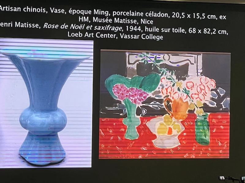 德·夏西在主旨演讲中梳理了赵无极和马蒂斯艺术之间千丝万缕的关系。赵无极于20世纪30至40年代在中国创作的作品就体现了试图理解、效仿欧洲现代主义画家——尤其是塞尚、毕加索和马蒂斯作品的倾向。这一时期以及初到法国的作品均可见1920至1930年间马蒂斯作品的风格特点。但此后,马蒂斯式风格很快让位于其他更适用于其自身的视觉语言,如保罗·克利和巴黎抽象表现主义。在长达四十年的时间里,马蒂斯式风格从他的画面上消隐。同样,“中国”也在他的画面中消失直至1971年。赵无极于1949至1957年间交往的朋友圈经常与艺评家、马蒂斯的女婿乔治·杜图(Georges Duthuit)往来并受其影响。作为赵无极的亲密朋友,杜图对中国艺术也颇有兴趣,他在1936年出版《中国神秘主义与现代绘画》一书,将中国画与19至20世纪西方绘画尤其是马蒂斯的作品进行比较。马蒂斯自野兽派时期尤其是1910年初起,也对中国艺术产生兴趣。1980年代,赵无极创作了至少三件向马蒂斯致敬的作品,这不仅是向马蒂斯致敬,也是向中国艺术致敬。