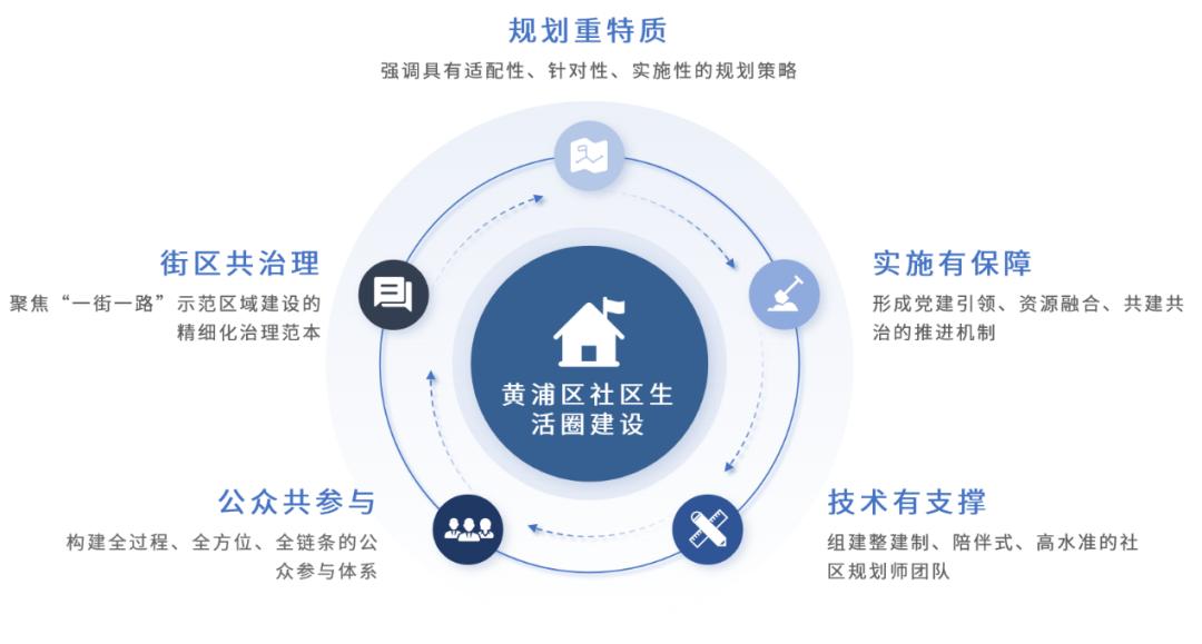 黄浦区的社区生活圈规划机制强调全域规划统筹引领,多元人群共建共融。总体突出五大特色亮点,从规划、实施、技术支撑、公共参与、街区治理全过程推动社区生活圈规划工作。规划强调在社区规划中应用适配性、针对性、实施性的规划策略;在实施过程中形成党建引领、资源融合、共建共治的推进机制;组建整建制、陪伴式、高水准的社区规划师团队作为社区规划的技术支撑;在推进过程中强调全过程人民民主,构建全过程、全方位、全链条的公众参与体系;治理层面则聚焦“一街一路”示范区域建设的精细化治理范本。