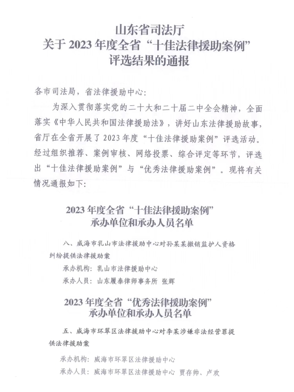 喜报!我市在山东省2023年度“十佳法律援助案例”评选活动中获得佳绩