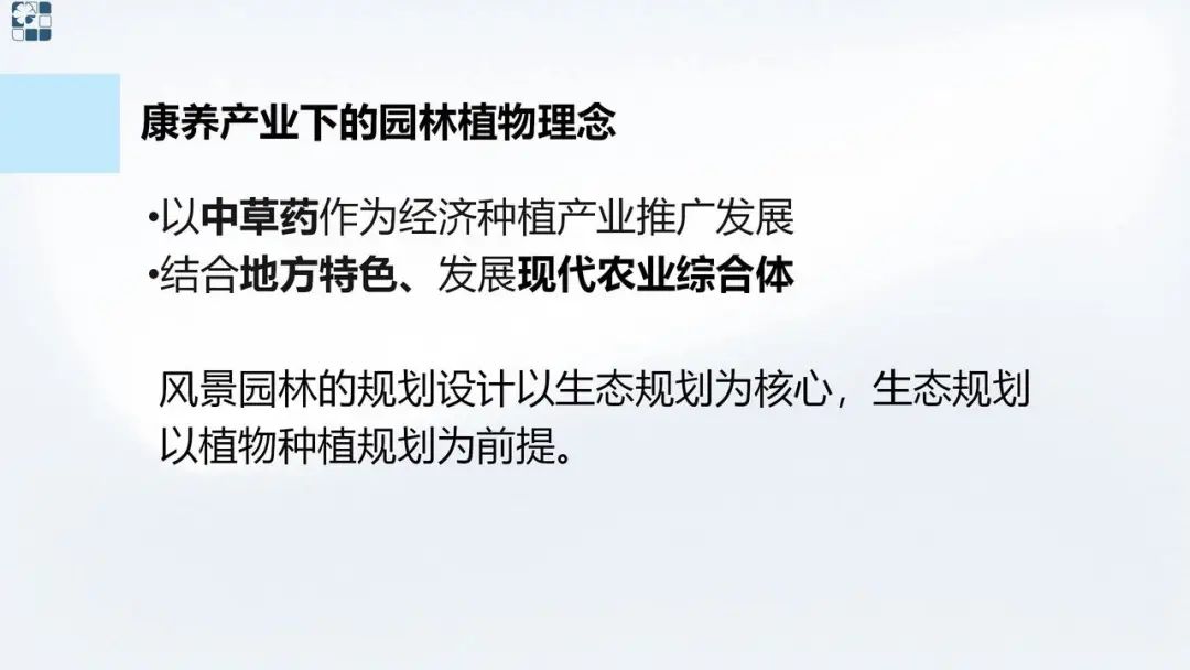 “大健康”是根据时代发展、社会需求与疾病谱的改变,提出的一种全局的理念。大健康产业可以理解为围绕满足各类健康(身体、精神、环境)需求的所有产业总称。康养产业下的园林植物理念首先是以中草药作为经济种植产业推广发展,同时是结合地方特色、发展现代农业综合体。风景园林的规划设计以生态规划为核心,生态规划以植物种植规划为前提。