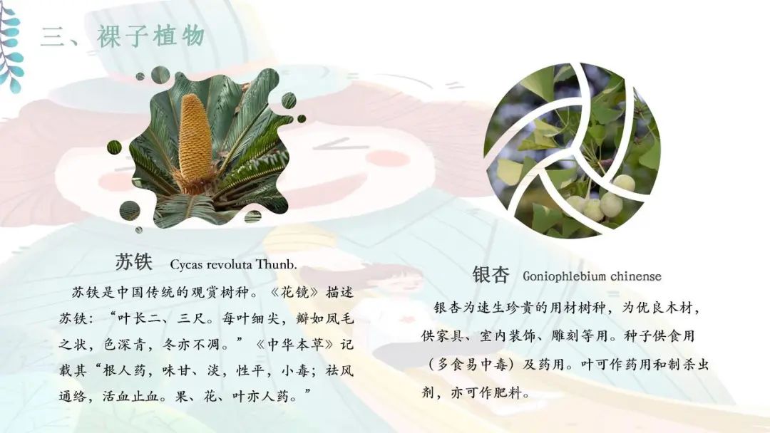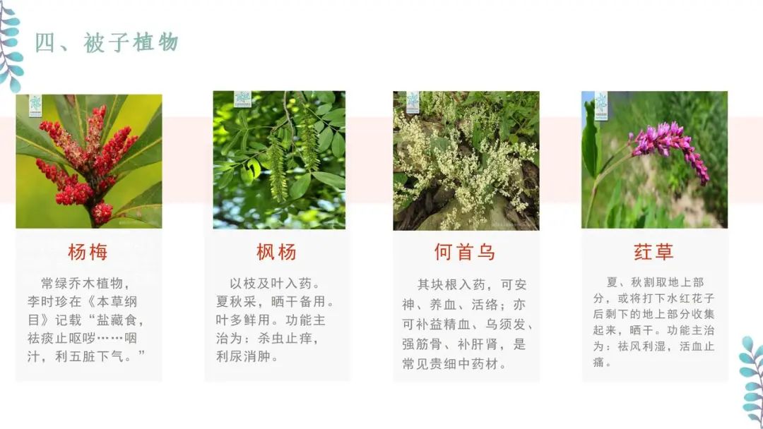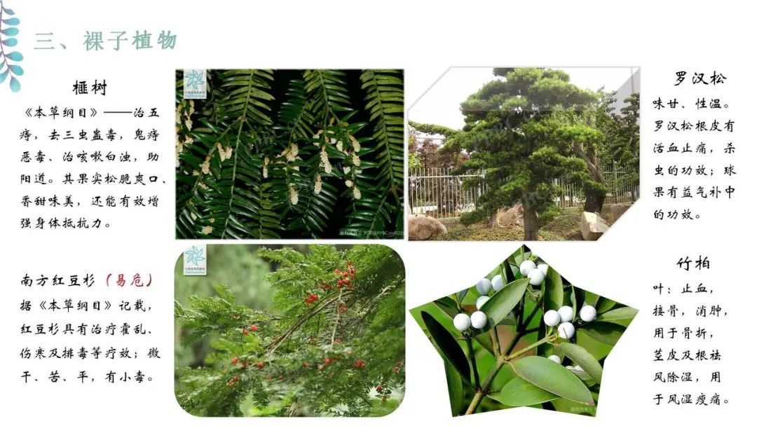 植物主要分为种子植物、苔藓植物、蕨类植物、藻类等四类。其中很多人会把种子植物分为两种,分别是外边没有的果皮包裹的裸子植物、有果皮外包着的被子植物。分享人从海军军医大学黄宝康教授所编著的《上海地区高等植物名录》一书中,选取适合园林栽培且具有药效的一些植物来重点介绍。