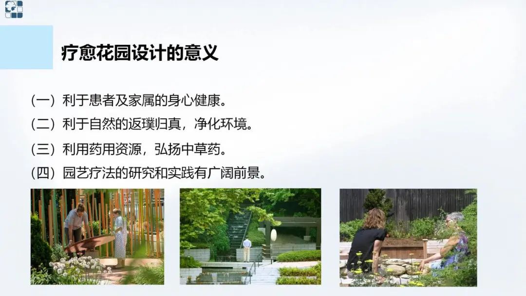 疗愈花园或称康健花园、康复医疗花园,由自然景观和人文景观组成,可帮助病人尽早恢复健康,减轻使用者的压力,改善生理和心理状况,从而达到治疗的目的。