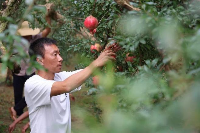 微风拂过,石榴微微晃动。看到石榴“招手”,被“邀请”的果农走过来定睛看着它,判断这颗石榴是否达到了可采摘标准。