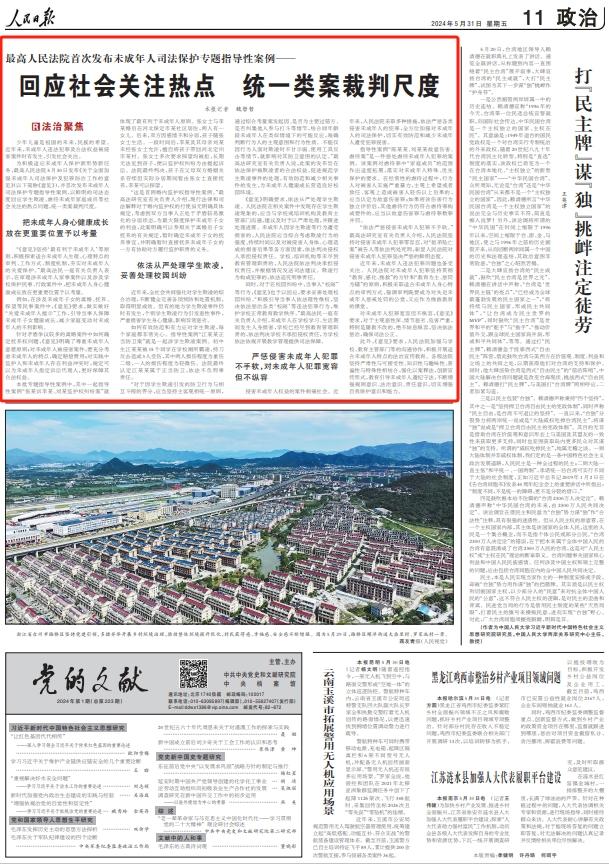为积极适应未成年人保护新形势新任务,最高人民法院5月30日发布《关于全面加强未成年人司法保护及犯罪防治工作的意见》(以下简称《意见》),并首次发布未成年人司法保护专题指导性案例,以鲜明的司法态度回应学生欺凌、虐待未成年家庭成员等社会关注的热点问题,统一类案裁判尺度。