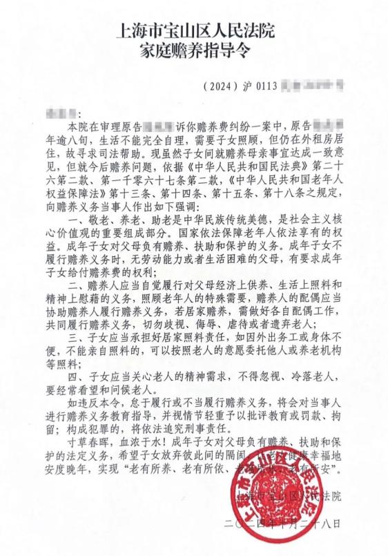 近日,上海市宝山区人民法院(以下简称宝山区人民法院)妥善化解一起涉检察院支持的高龄老人起诉赡养费纠纷案,不仅解决了老人的生活困境,更促进了家庭成员之间的和睦相处。同时,为强化矛盾化解成效,宝山区人民法院还针对赡养义务人发出了首份《家庭赡养指导令》,以司法之力牢牢守护老人合法权益。