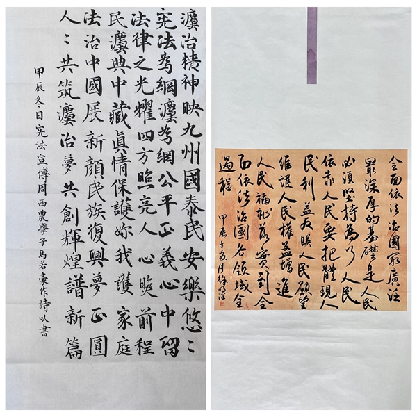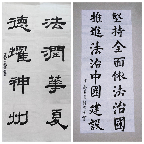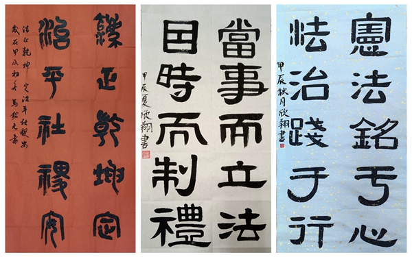 我校广大师生结合“宪法”“法治”和“法治中国”等主题创作了多幅作品,充分展现了学法用法、依法办事的良好精神风貌,各作品贴近师生、贴近生活、贴近实际,进一步阐释了传统文化作品的艺术魅力。挥洒笔墨的文化作品不仅书写着中国的法治精神,也浸润着师生对美好生活的向往,在激发广大师生传统文化兴趣的同时有效助力校园法治宣传教育走深走实。