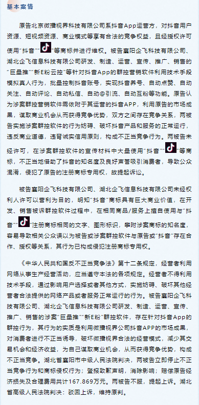 同为互联网服务经营者,明知抖音平台用户服务协议内容、各项功能、商业模式及影响力,却针对抖音APP研发群控软件,系利用技术手段通过影响用户选择或者其他方式,实施妨碍、破坏其他经营者合法提供的网络产品或者服务正常运行的行为,实质上是利用抖音APP的市场成果,为自己谋取商业机会,从而获得竞争优势,此种“搭便车”行为,违反商业道德和诚实信用原则,为反不正当竞争法所禁止;既损害了同业竞争者的合法权益,又对行业正常经营秩序以及消费者的合法权益构成损害,应依法承担相应民事责任。