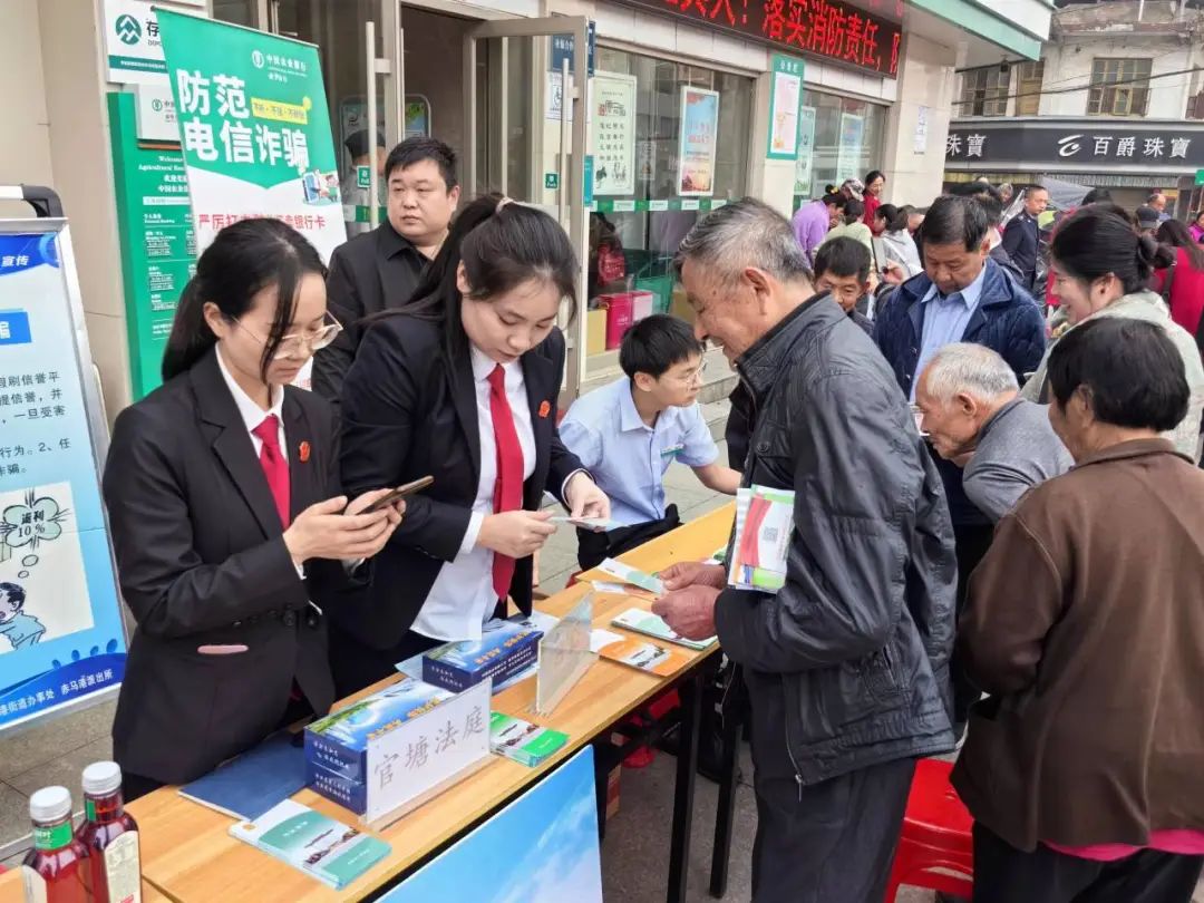 官塘人民法庭与当地派出所、交警中队、官塘税务分局等单位在官塘驿镇街头联合开展法治宣传活动,面对面普及法律知识。