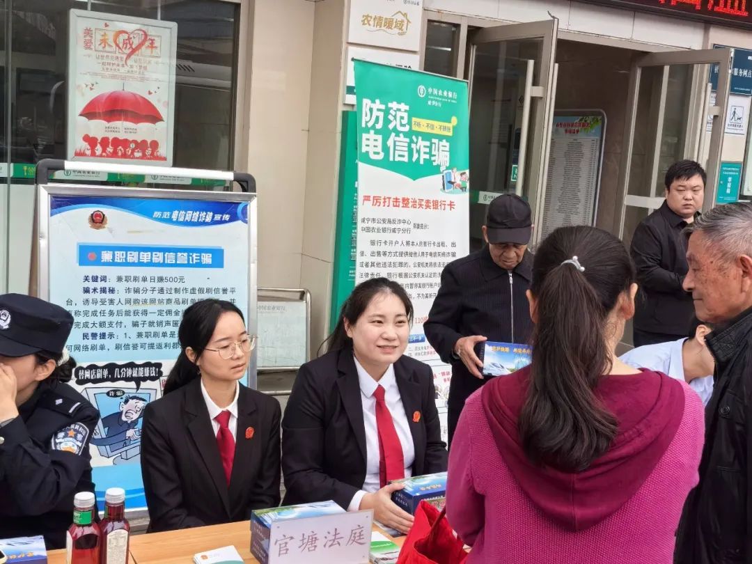 在官塘农业银行展位前,李佳璇法官通过知识宣传讲座、发放宣传单、互动问答等环节,向居民们宣讲宪法、民法典、反有组织犯罪法等有关法律知识,发放反诈防骗知识宣传手册,现场下载反诈APP。