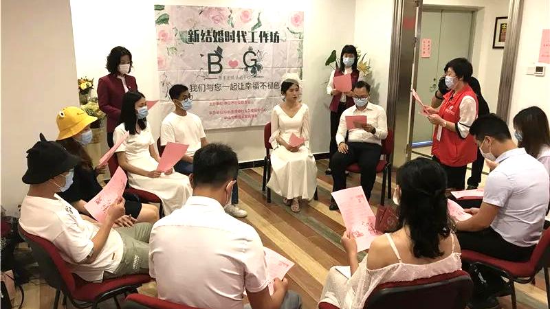 市民政局婚姻家庭辅导室为准夫妻们开展婚前教育,给婚姻幸福打好“预防针”。