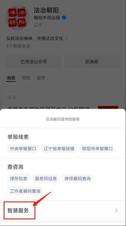 您只需扫描下方二维码,或通过微信搜索并关注【法治朝阳】公众号,在菜单中点击【智慧服务】就能进入朝阳市公共法律服务平台。