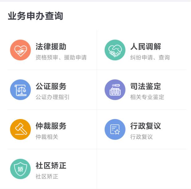 法律援助、人民调解、公证办理、司法鉴定、仲裁、行政复议、社区矫正业务指引一步到位。