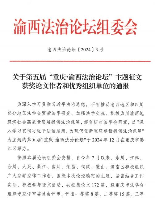 日前,第五届“重庆·渝西法治论坛”主题征文活动评奖结果揭晓,本次活动共征集论文172篇,经重庆市法学会组织专家评审委员会评审,评出一等奖8篇、二等奖15篇、三等奖25篇、优秀奖30篇,推荐评出优秀组织奖19个。其中,我院3篇论文分别荣获一等奖、二等奖、优秀奖!