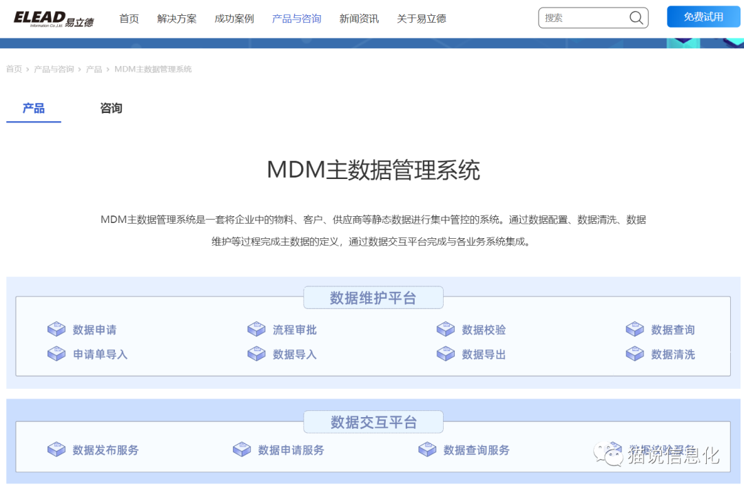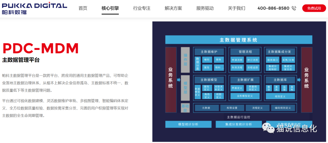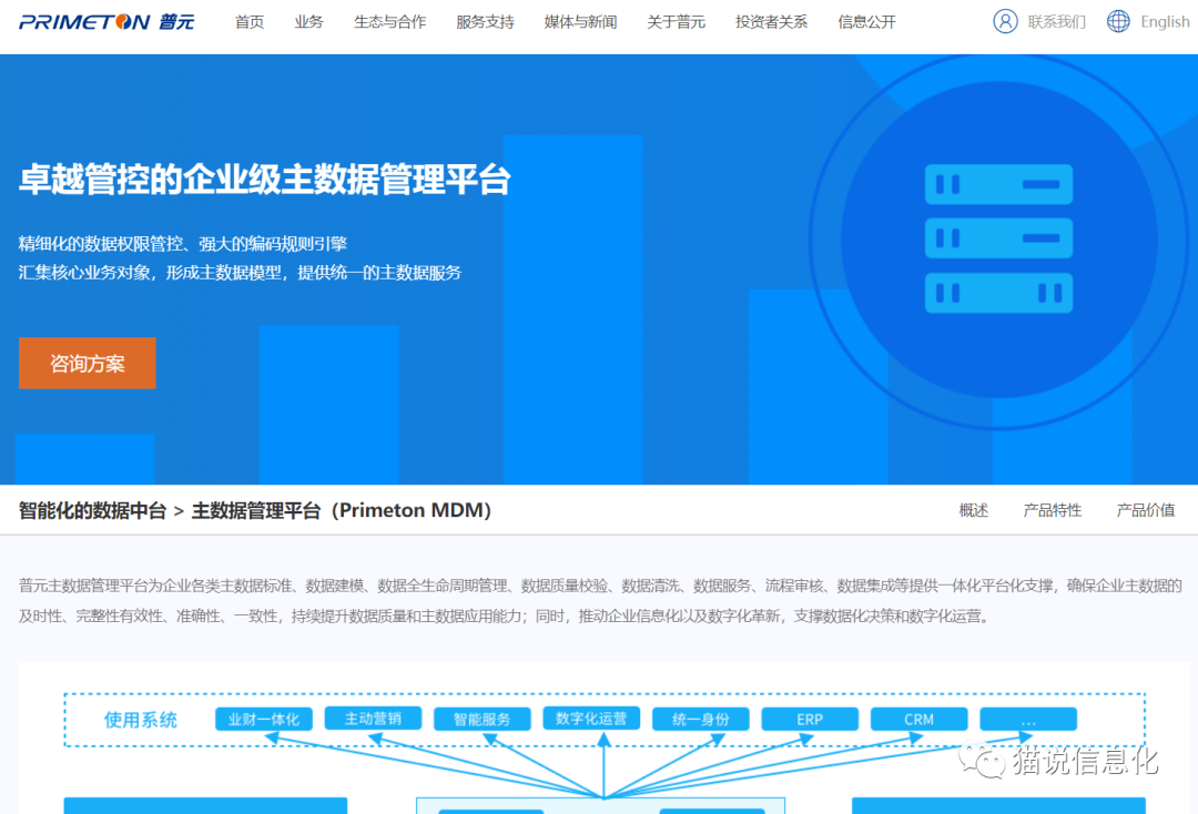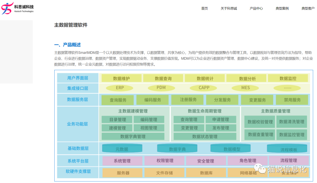 在多系统集成时主数据管理系统(MDM)是很常用的软件,例如异构系统之间,跨组织应用的系统之间。因为很常用,所以开发主数据管理软件产品的厂商也很多,首先是以包括主数据管理系统为主要产品的一些专业的数据管理类软件厂商,而且这些厂商不少都是从主数据管理起步逐渐发展为综合性数据软件厂商的,例如三维天地、美林、亿信华辰等。还有一些专业数据类软件厂商开展过主数据业务,但现在从其官方资料中不能直接找到主数据的内容,可能是涵盖在其大数据平台、数据治理平台等产品中了,这部分厂商本文暂不介绍。其次是包括以ERP软件产品为核心的企业管理软件厂商,例如用友、金蝶、浪潮、SAP等,较多的企业信息化项目是以ERP系统为核心按需集成相关应用系统的,那么为了更好的实现集成,ERP软件厂商就相应开发了主数据管理软件产品。再例如一些有规模的、综合性的企业信息化厂商,因为这些厂商承建的很多项目都有大量的系统集成内容,所以也开发了自己的主数据管理软件,比如汉得、元年、石化盈科、昆仑数智、英诺森、软通动力等。还有若干种情况,总的来说,如果厂商经常要实现系统集成应用,往往就会开发自己的主数据管理软件产品。此处需要说明的是,主数据首先是用于系统集成的,主数据管理是为了实现系统集成时数据和业务的互通互联,保障主数据的唯一性、标准性和共享性的,进而保障业务数据的一致性。所以很多年前在面向服务的体系架构下(SOA),与企业服务总线系统(ESB)一起,很好的解决了系统集成的问题。而主数据作为数据的一种,自然也会被列入数据治理的范畴内,并随着近些年开始被广泛重视的数据治理而被进一步关注到,但实际上主数据以及主数据管理系统是远远早于数据治理热潮之前就被广泛应用的,主数据管理软件的产品也已很成熟,并且也随着技术的发展,在本地部署的产品之外也出现了云版本的产品,为用户提供了更多的选择。