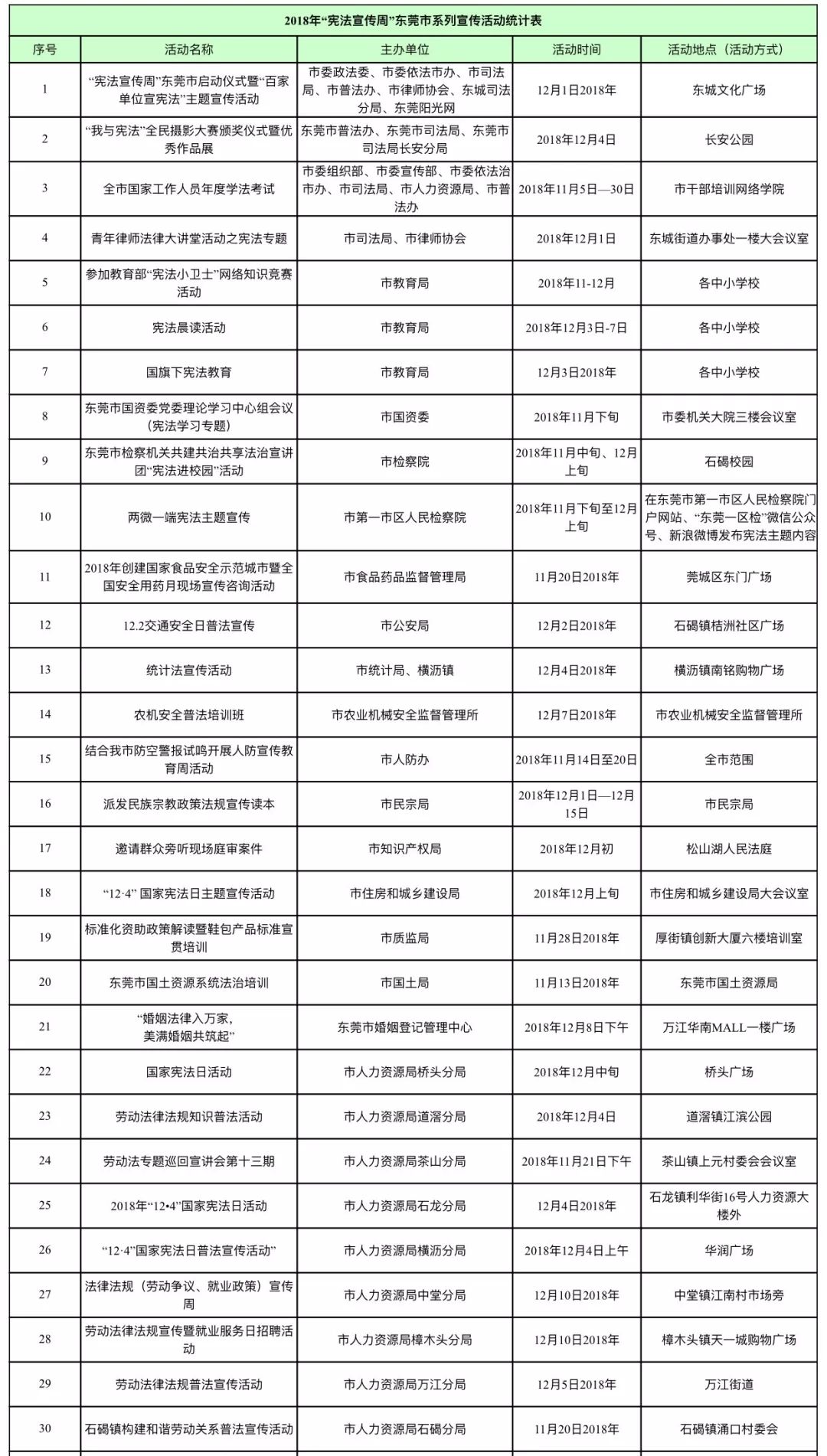 市委政法委、市委依法治市办、市司法局、市普法办、市法学会计划联合相关单位,于12月1日上午,在东城文化广场举办以“尊崇宪法、学习宪法、遵守宪法、维护宪法、运用宪法”为主题的2018年“宪法宣传周”东莞市启动仪式暨“百家单位宣宪法”主题宣传活动。