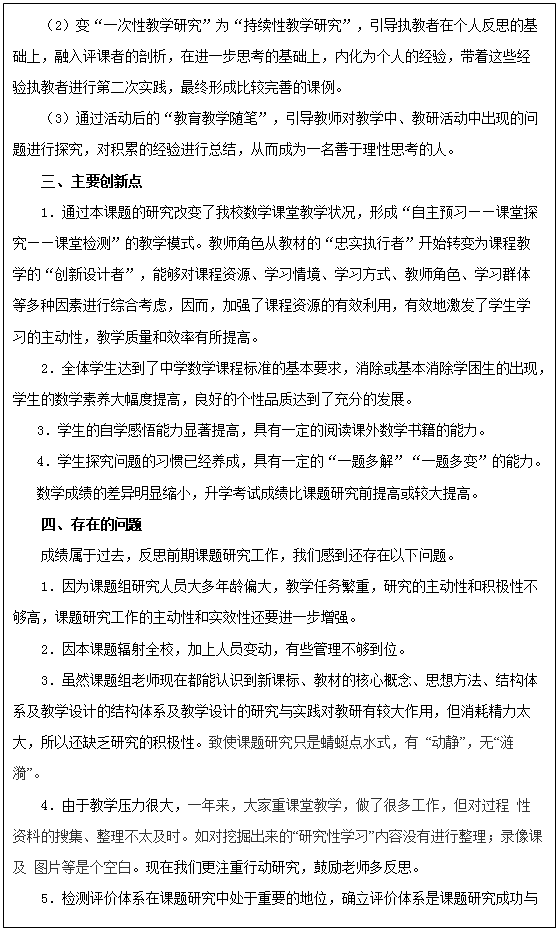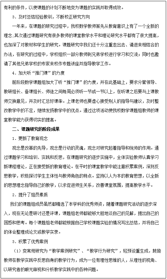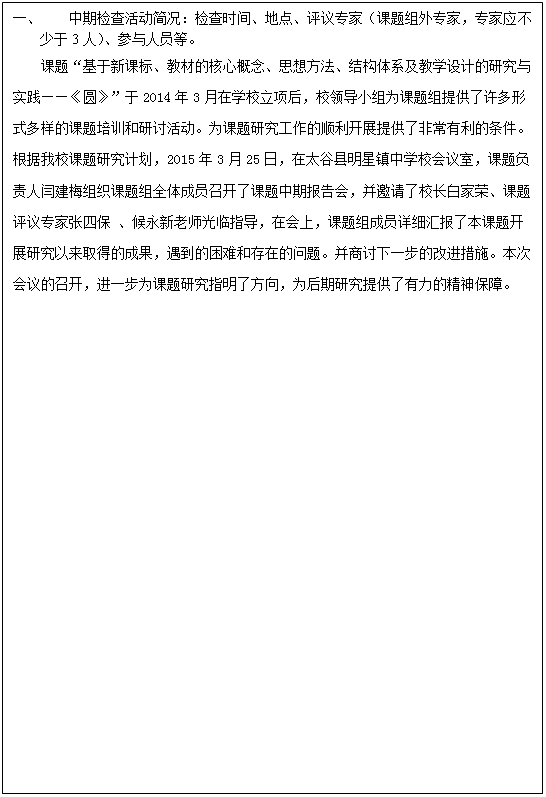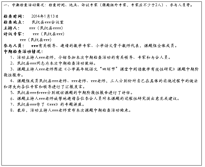 中期检查活动主要是分析已取得的研究成果,研讨课题研究的可持续性,重点是反思、归纳、深化、细化。