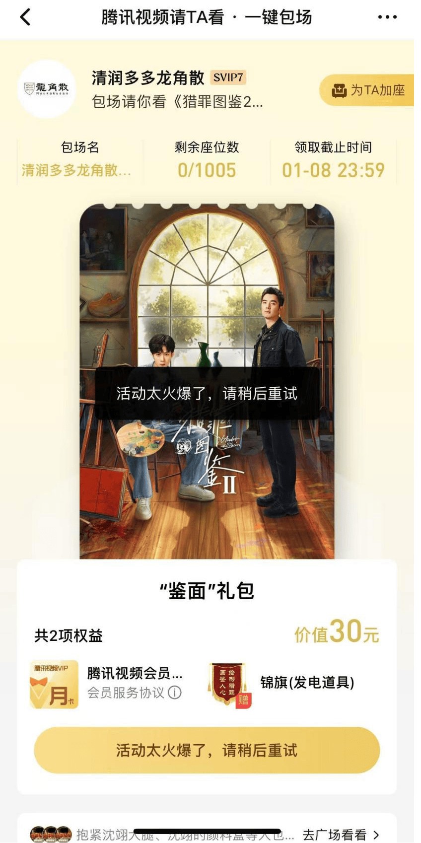 除了在广告中采用诸如“一笔绘人心,一颗好声音”、“草本之力,清润解密”、“百年草本清润,守护正义之声”等与剧集高度匹配的植入内容外,龙角散还在猎罪2首播当日,在腾讯视频进行云包场观剧活动,引发了大量剧粉参与,活动仅上线不到一分钟,1000+免费观剧资格即被抢夺一空。