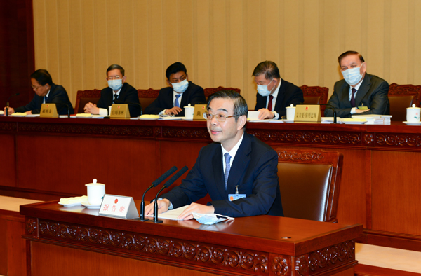 图为周强作关于人民法院加强民事审判工作依法服务保障经济社会持续健康发展情况的报告。马增科 摄