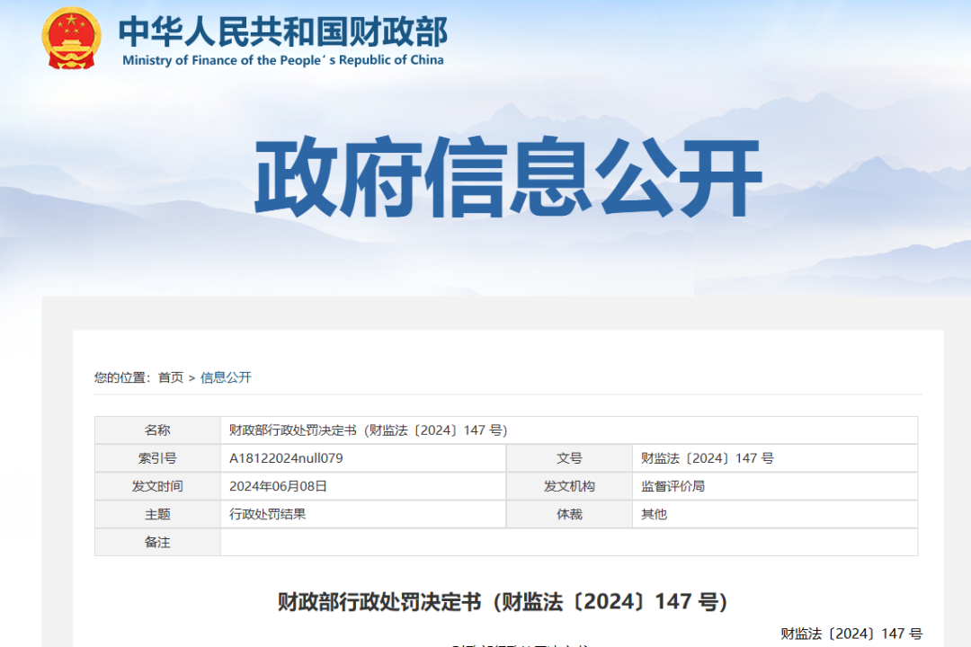 财政部行政处罚决定书(财监法〔2024〕147 号)