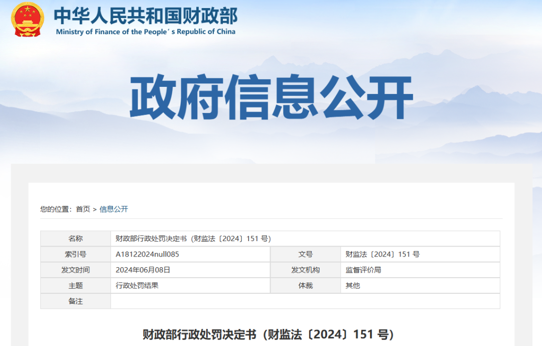 财政部行政处罚决定书(财监法〔2024〕151 号)