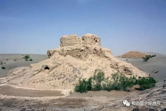 喀拉墩古城 位于克利雅河下游处的沙漠中,是国家级文物保护单位。喀拉墩维吾尔语的意思为"黑色的沙丘"。古城堡方形,边长60米。土墙现高8米,基底宽20米,顶宽8米。城墙系用一层树枝、一层泥土交相垒筑,极耐风蚀。东城墙偏北段有门道。