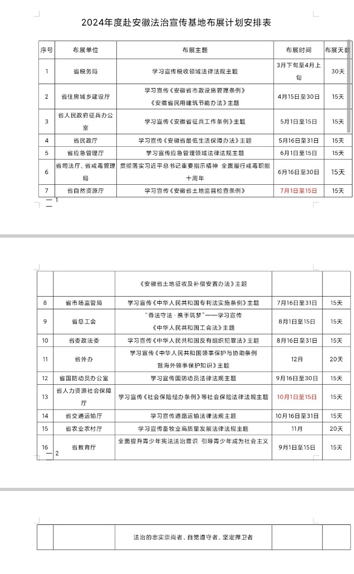 大皖新闻讯 2月1日,大皖新闻记者从安徽省法宣办获悉,今年,省法宣办将会同省直及中央驻皖17个重点普法责任单位,在安徽法治宣传基地组织开展16场跨年系列主题普法活动,推动各项普法责任的落实。