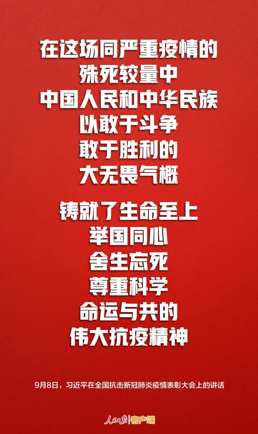 9月8日上午,全国抗击新冠肺炎疫情表彰大会在北京人民大会堂隆重举行。习近平向国家勋章和国家荣誉称号获得者颁授勋章奖章并发表重要讲话。在讲话中,习近平就伟大抗疫精神进行了深刻阐述。他说,在这场同严重疫情的殊死较量中,中国人民和中华民族以敢于斗争、敢于胜利的大无畏气概,铸就了生命至上、举国同心、舍生忘死、尊重科学、命运与共的伟大抗疫精神。